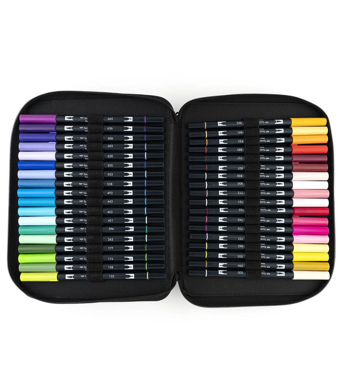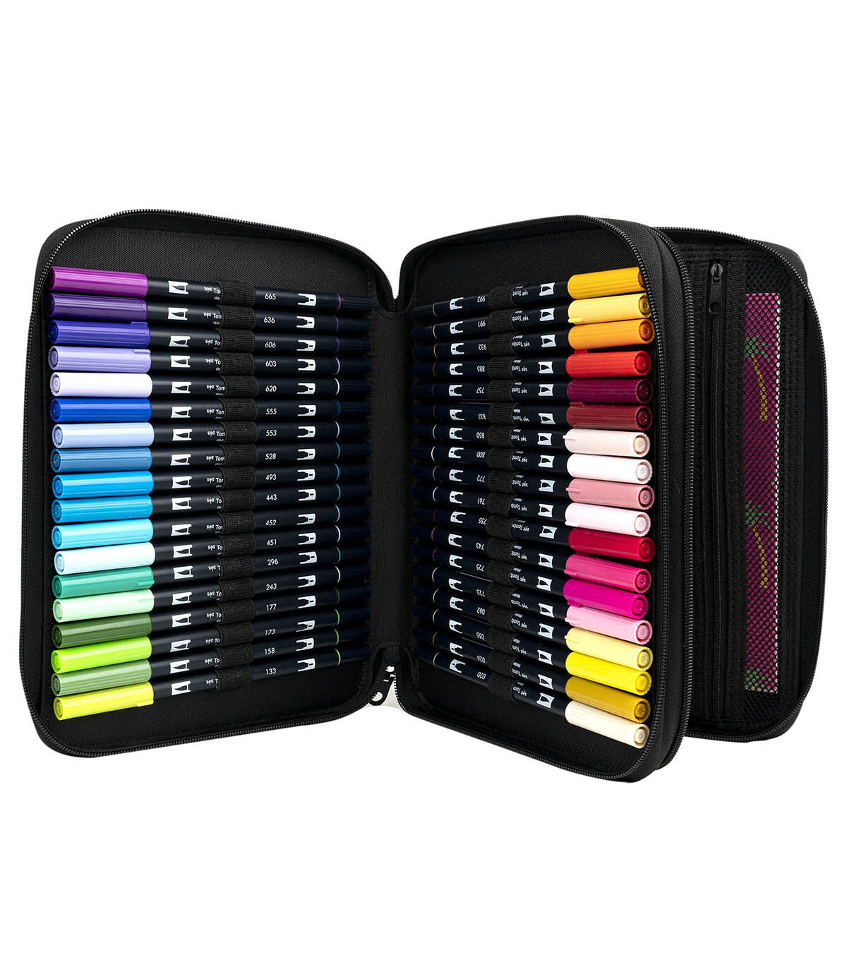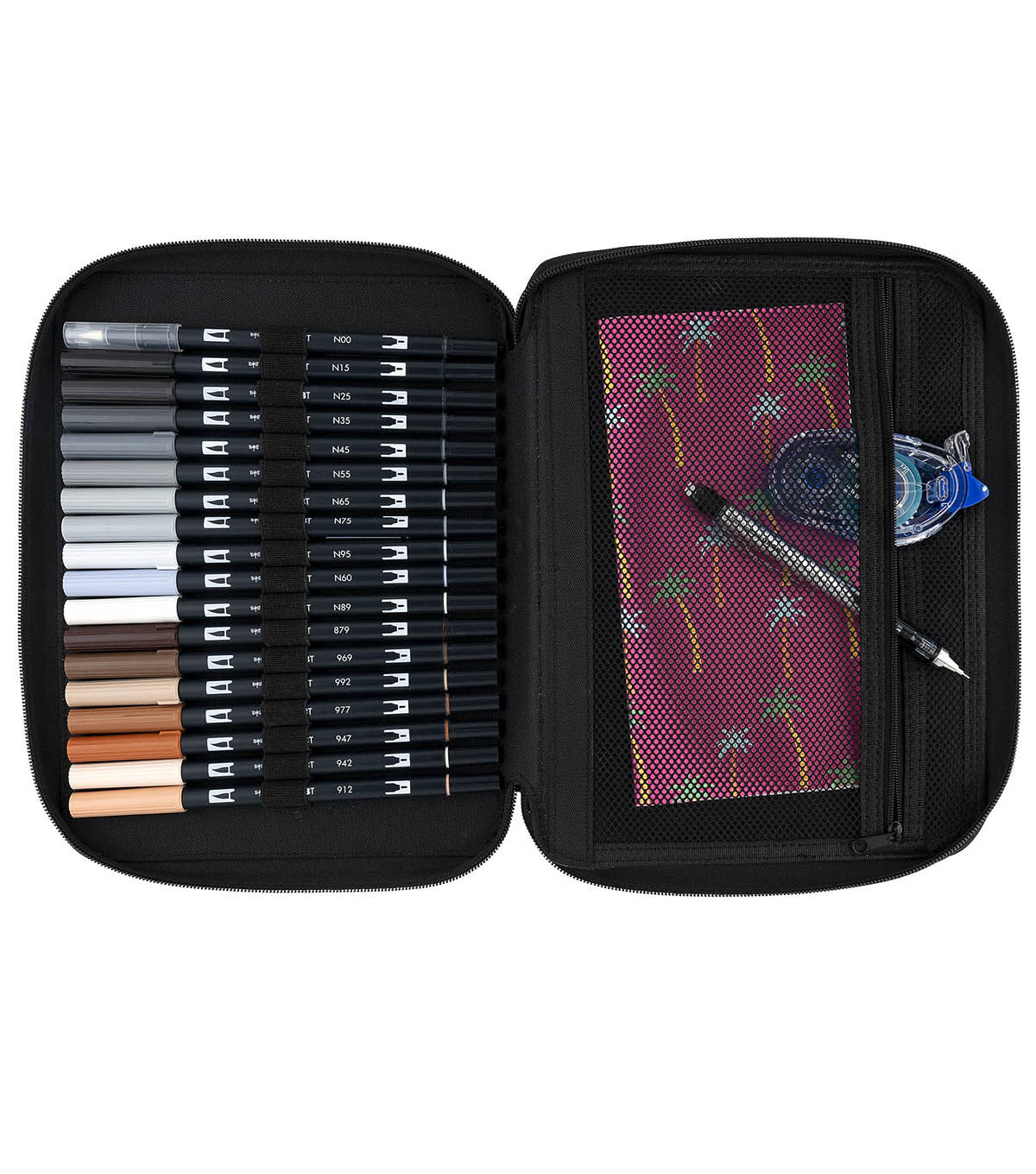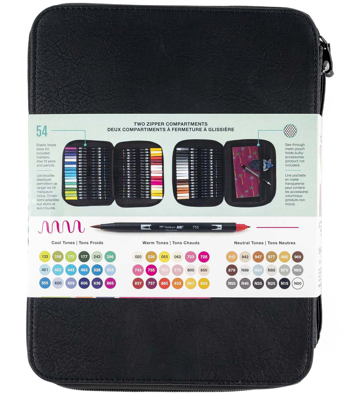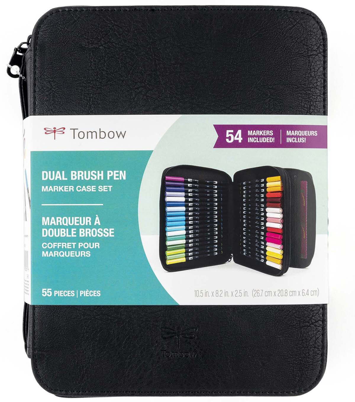 Set of 54 Dual Brush Pens in Marker Storage Case. Perfect for on-the-go art and craft projects, this set includes markers in Cool Tones, Warm Tones and Neutral Tones. Dual Brush Pens feature flexible brush tip and fine tip in one marker. Brush tip works like a paintbrush to create fine, medium or bold strokes; fine tip gives consistent lines. The water-based ink is blendable and the resilient nylon brush retains its point stroke after stroke. Portable Marker Storage Case features two divided compartments with zipper closures so your items easily stay in place. Case features 54 elastic loops to store included markers –also fits pens and pencils. Interior zippered pouch holds bulky accessories and is made of see-through mesh, allowing you to quickly see what’s inside. Includes carry handle for easy portability. Faux leather exterior easily wipes clean.