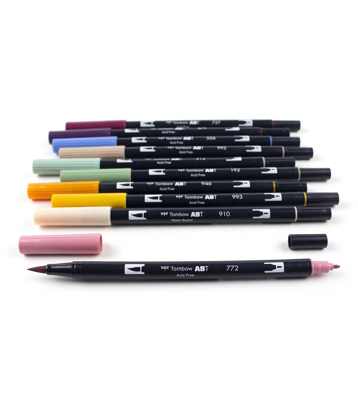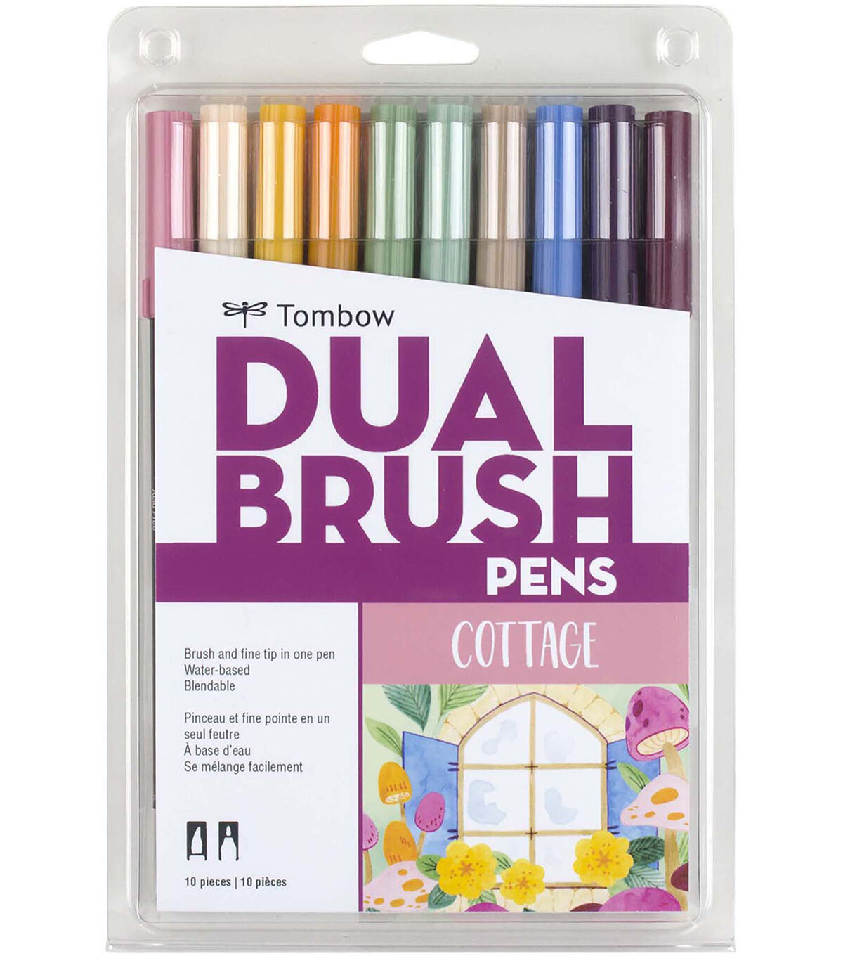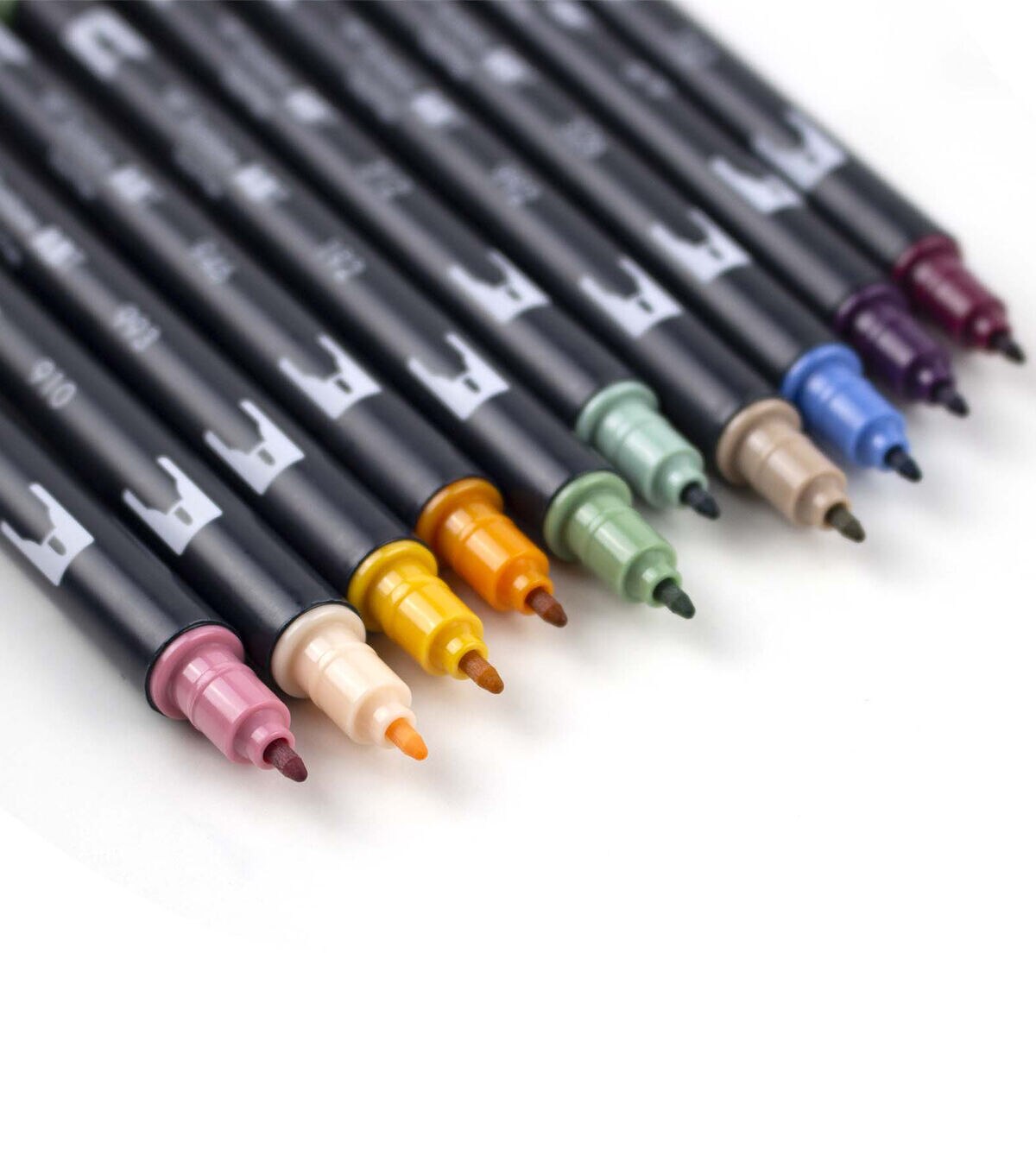 Set of 10 Colors. Dual Brush Pens feature flexible brush tip and fine tip in one marker. Brush tip works like a paintbrush to create fine, medium or bold strokes; fine tip gives consistent lines. Dual Brush Pens are ideal for artists and crafters. The water-based ink is blendable and the resilient nylon brush retains its point stroke after stroke. Colors include: 772 Dusty Rose, 910 Opal, 993 Chrome Orange, 946 Gold Ochre, 192 Asparagus, 312 Holly Green, 992 Sand, 526 True Blue, 679 Dark Plum, 757 Port Red. Colorless Blender Pen not included.