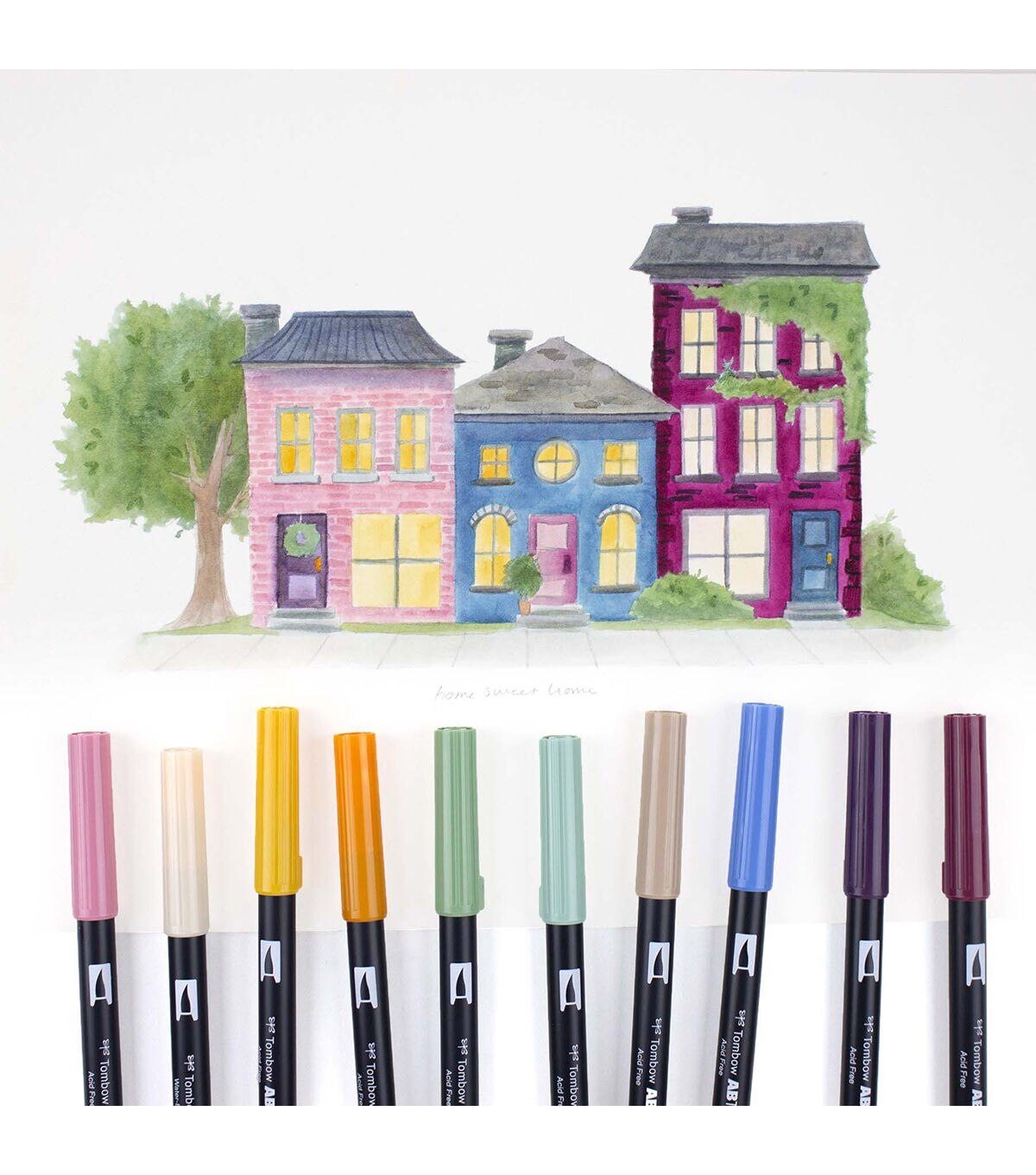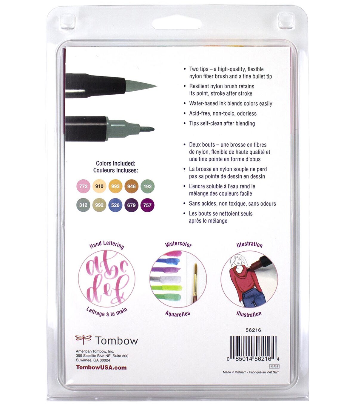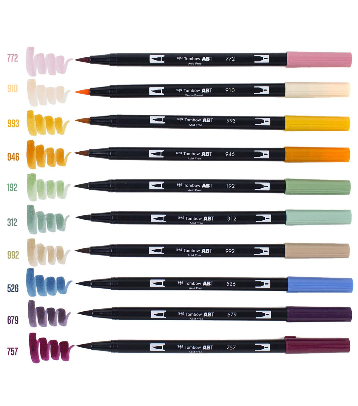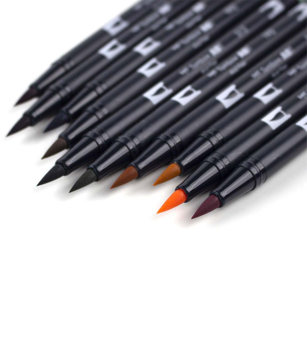 Set of 10 Colors. Dual Brush Pens feature flexible brush tip and fine tip in one marker. Brush tip works like a paintbrush to create fine, medium or bold strokes; fine tip gives consistent lines. Dual Brush Pens are ideal for artists and crafters. The water-based ink is blendable and the resilient nylon brush retains its point stroke after stroke. Colors include: 772 Dusty Rose, 910 Opal, 993 Chrome Orange, 946 Gold Ochre, 192 Asparagus, 312 Holly Green, 992 Sand, 526 True Blue, 679 Dark Plum, 757 Port Red. Colorless Blender Pen not included.