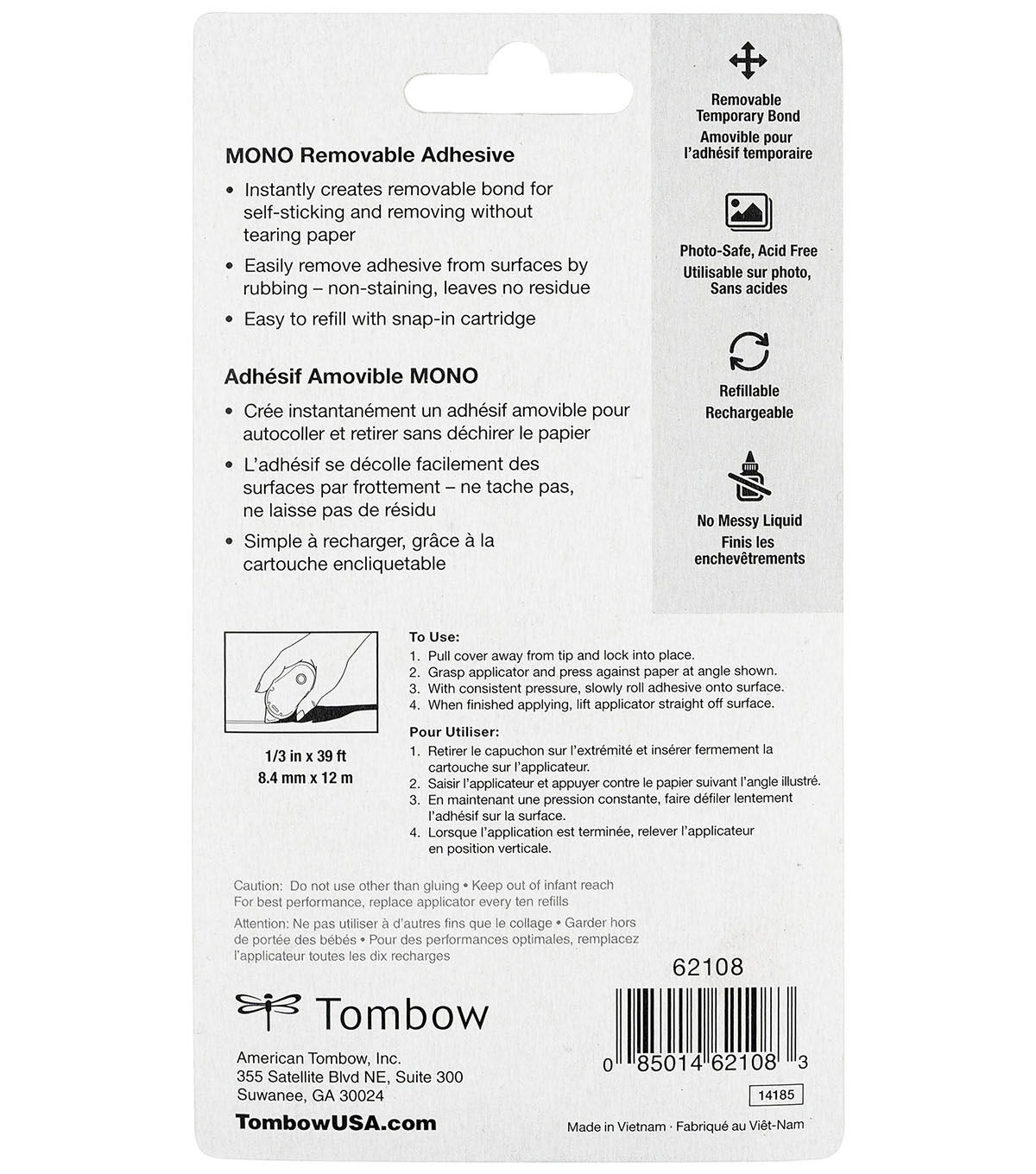 Instantly creates removable bond for self-sticking and removing. For use on paper, photos, cardstock, etc. Easy to refill with snap-in refill cartridge. Approved Photographic Activity Test (PAT). Removable bond.