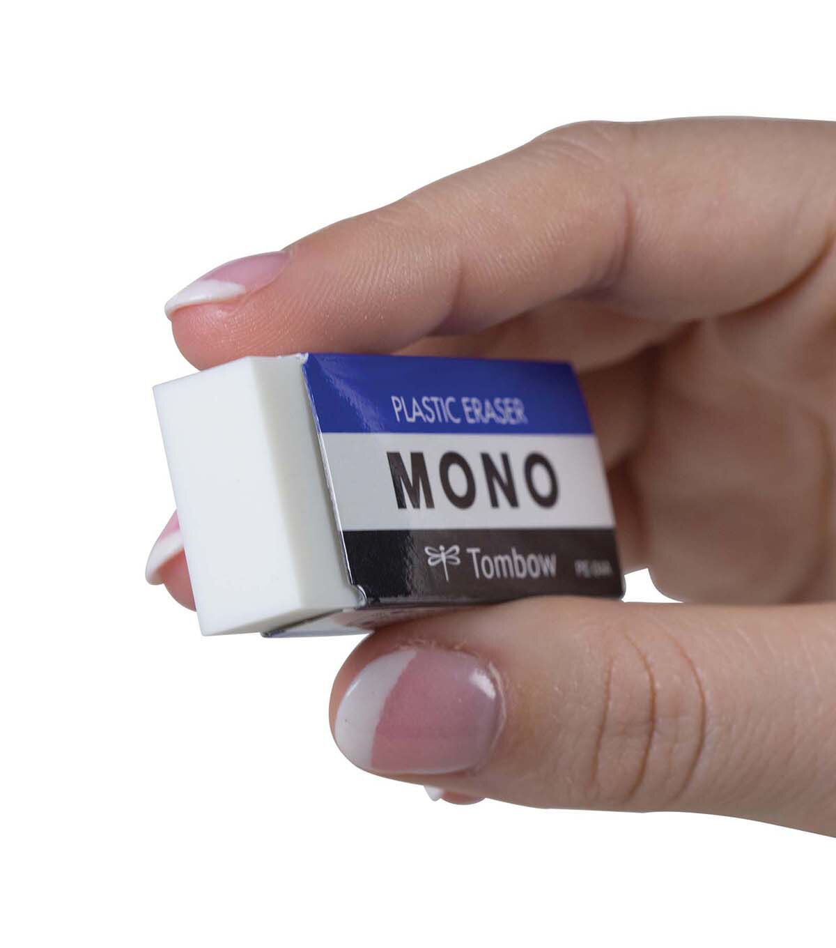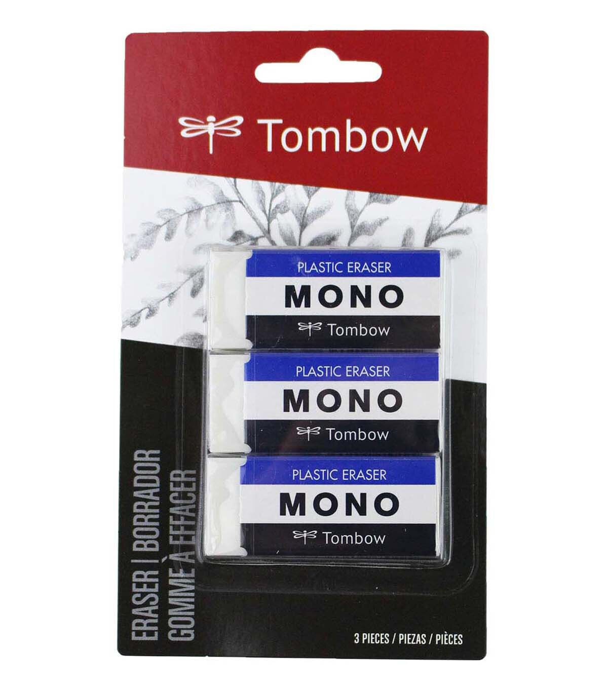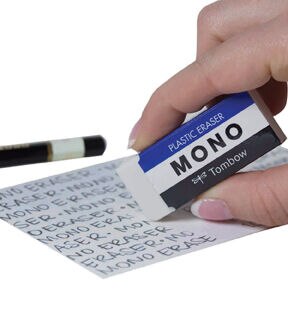 Remove marks cleanly with little pressure and no paper damage when using the MONO Eraser. This soft plastic eraser is gentle enough to erase line sketches under watercolor art. Pairs well with Tombow markers and won't smear ink. Protective paper sleeve with rounded corner edges keeps from damaging eraser during use. Great for art, school and office use. Includes 3 medium white MONO Erasers
