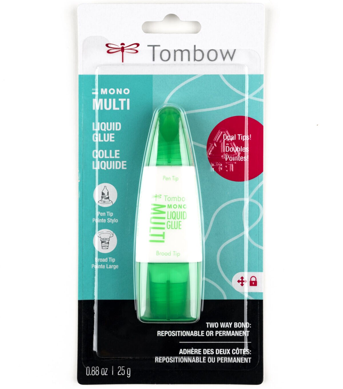 Tombow MONO Multi Liquid Glue is a multi-purpose glue that creates a repositionable or ultra strong permanent bond. Adhesive bonds two ways: permanent by applying while glue is still wet or removable by letting glue dry before positioning. Dual applicators in one ergonomic dispenser. Use the pen tip for small areas or for a fine line of glue and use the broad tip for large areas. Acid-free and photo-safe. 0.88 oz.