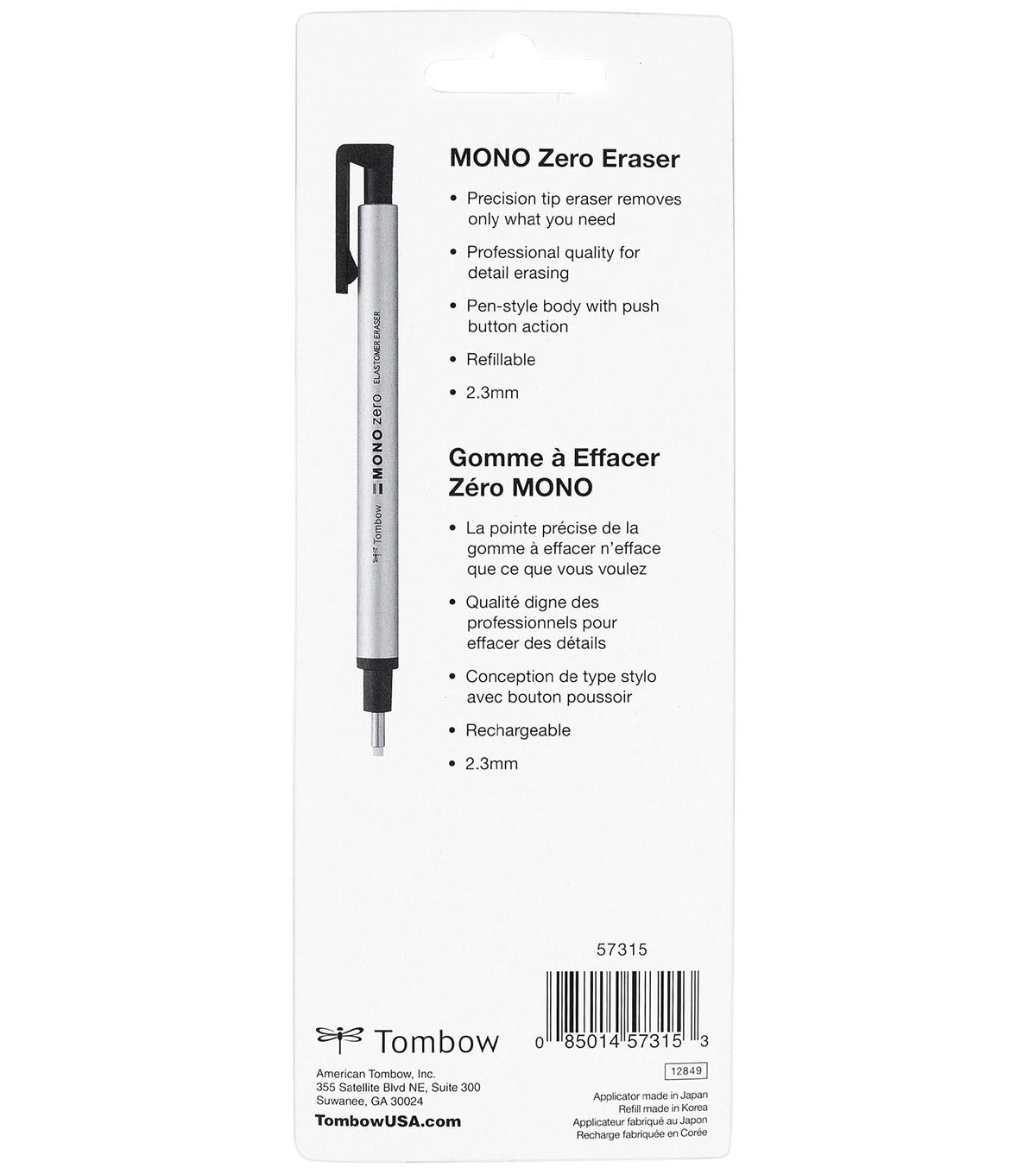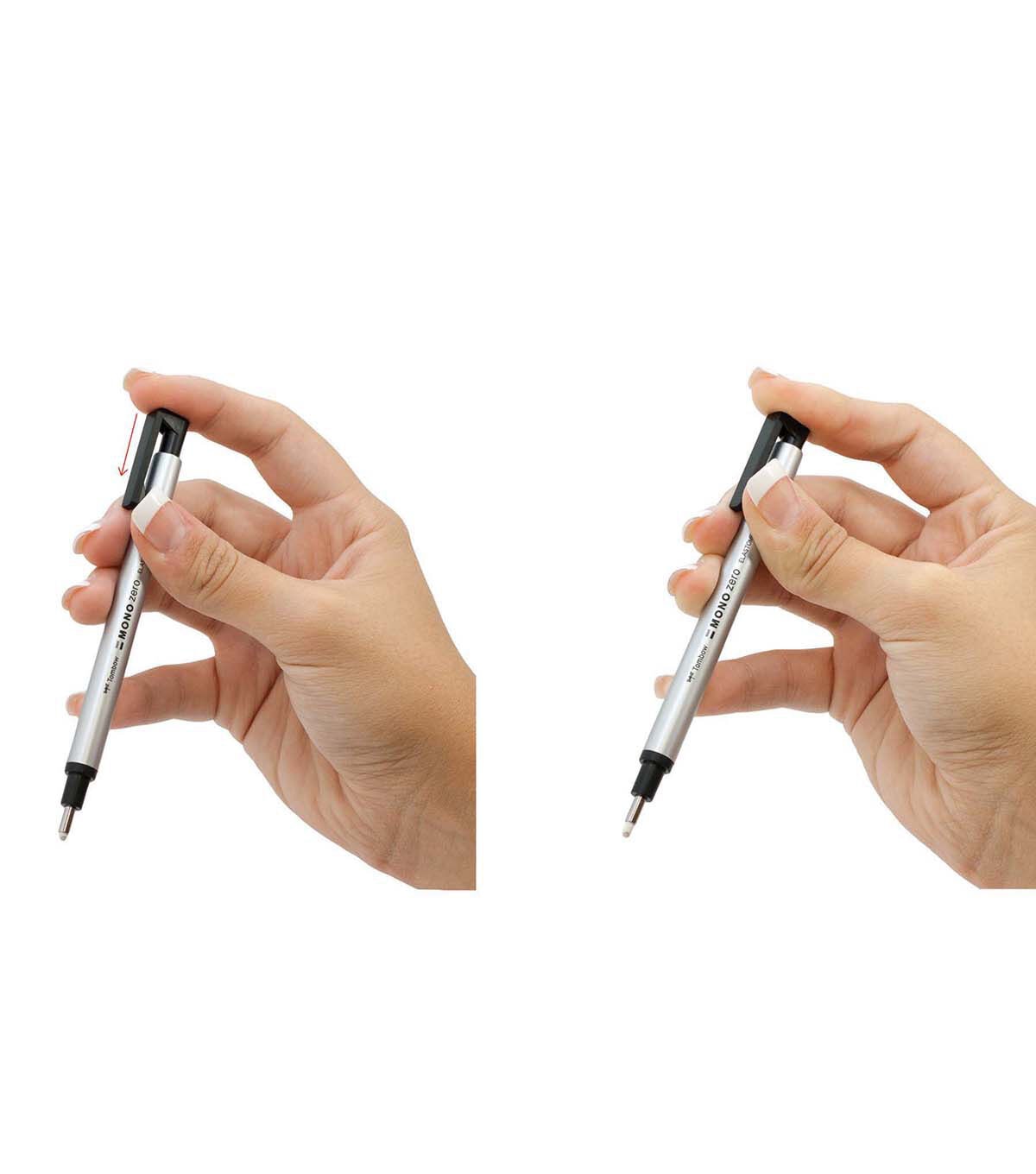 Value pack includes eraser and 2 refills. Protect your work and erase only what you need with the MONO Zero Eraser. This high quality, precision eraser is gentle enough to erase line sketches under watercolor art without damaging paper. Pen-style body is easy to use and store. Features push button advance and convenient clip for on-the-go corrections. Pairs well with Tombow markers and won't smear ink. Silver barrel. Round tip; 2.3mm diameter. Refillable. Rectangular tip value pack also available.