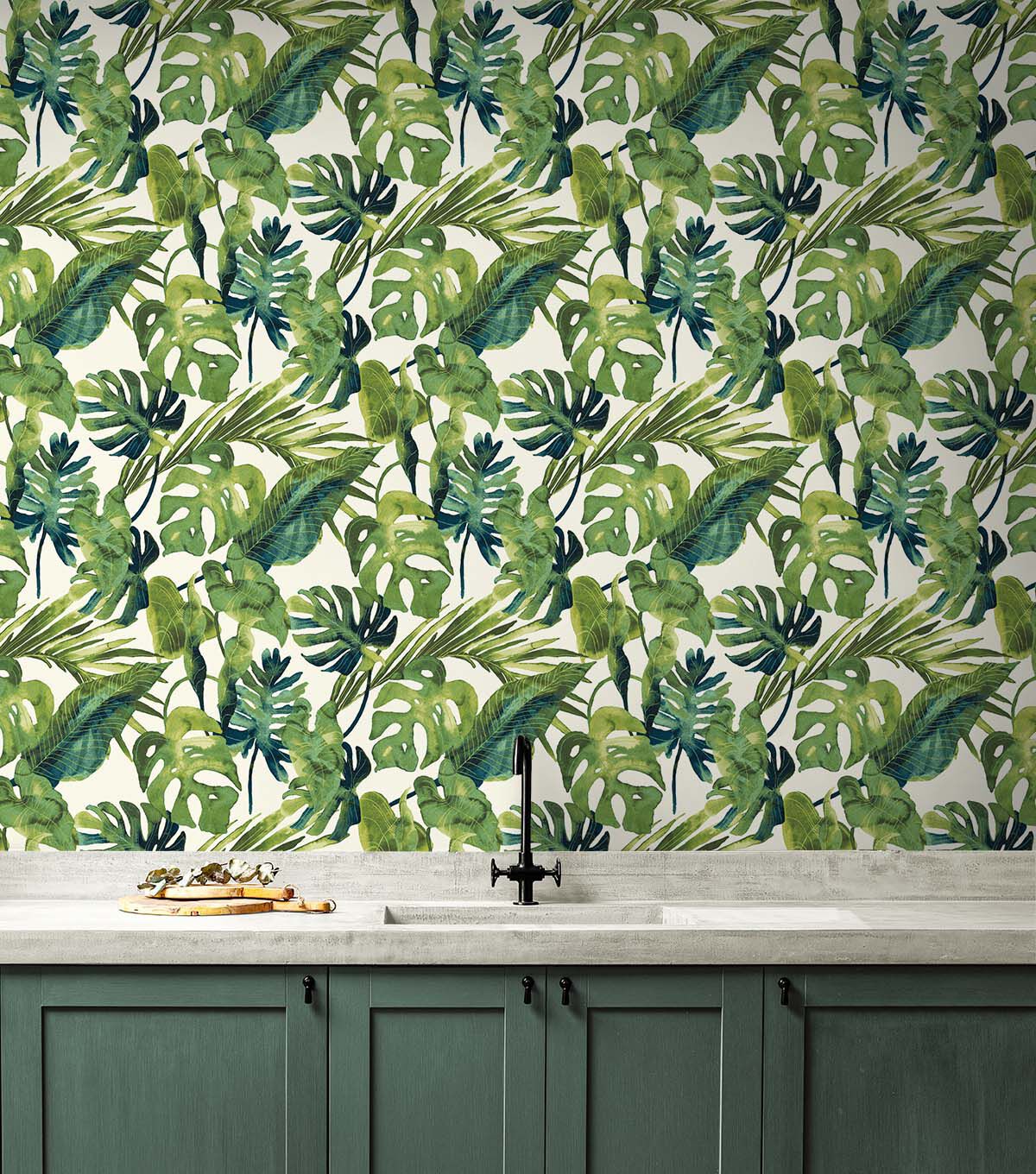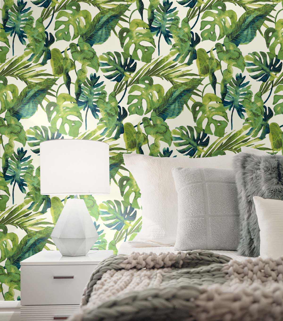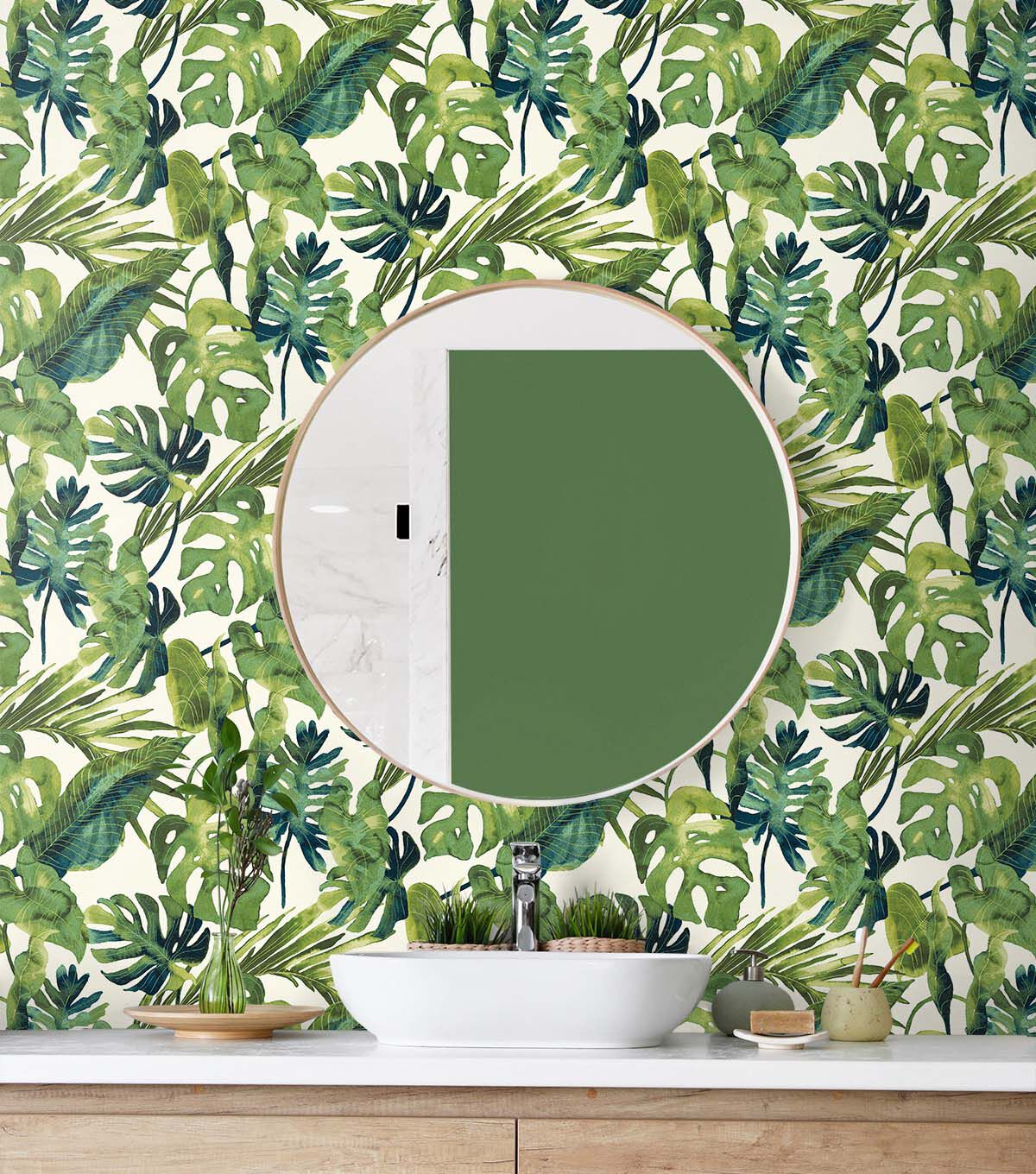 Iconic, well-known Tommy Bahama print Falling fronds is now available in high quality peel and stick wallpaper. Visually impactful, hand-painted from the Tommy Bahama artist’s studio with translucent dye, revealing the leaf under it and add a look of faint water droplets. Falling Fronds will bring a welcomed, fresh botanical interest to your interior. Each roll is 20.5 in. wide by 18 ft. long, covers 30.75 sq. ft. Tommy Bahama Falling Fronds is ready to use, DIY friendly. Repositionable and 100% removable without leaving any mess or sticky residue. Made in the USA.