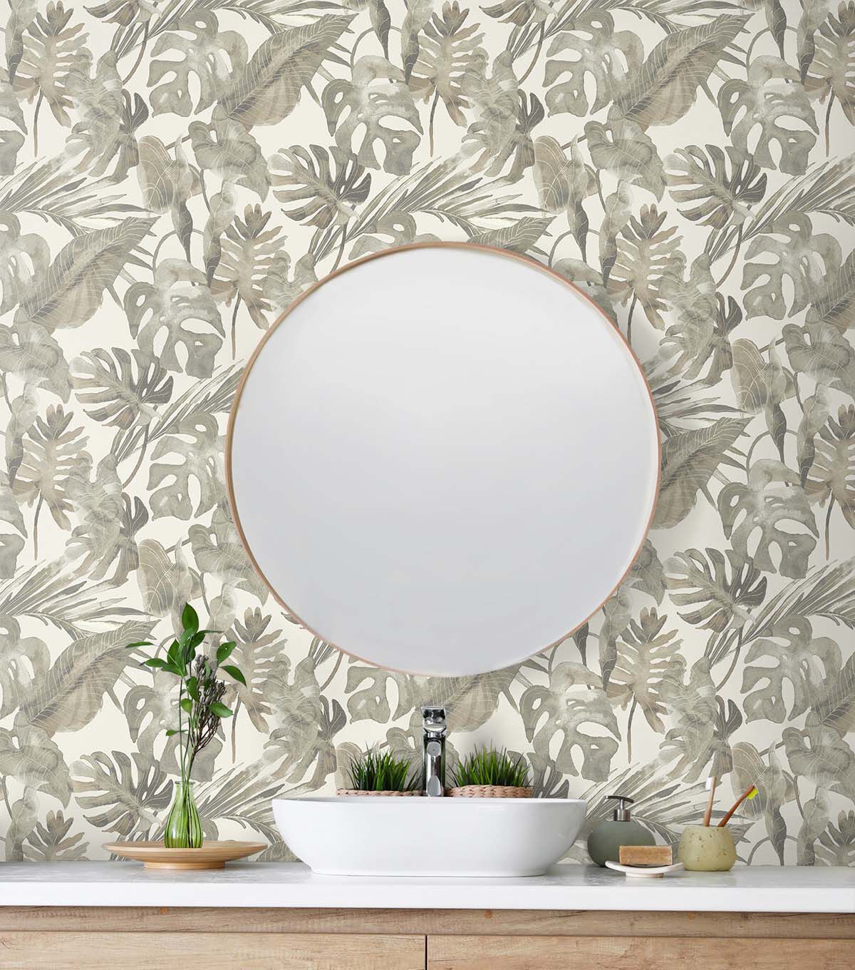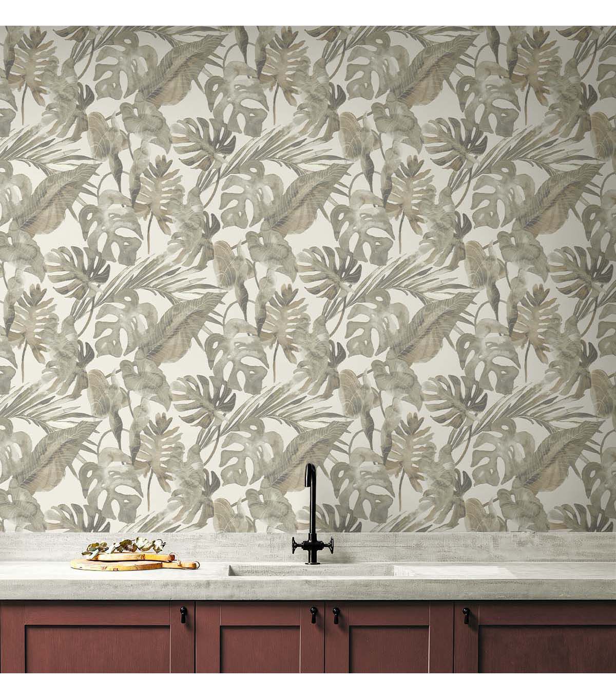 Iconic, well-known Tommy Bahama print Falling fronds is now available in high quality peel and stick wallpaper. Visually impactful, hand-painted from the Tommy Bahama artist’s studio with translucent dye, revealing the leaf under it and add a look of faint water droplets. Falling Fronds will bring a welcomed, fresh botanical interest to your interior. Each roll is 20.5 in. wide by 18 ft. long, covers 30.75 sq. ft. Tommy Bahama Falling Fronds is ready to use, DIY friendly. Repositionable and 100% removable without leaving any mess or sticky residue. Made in the USA.