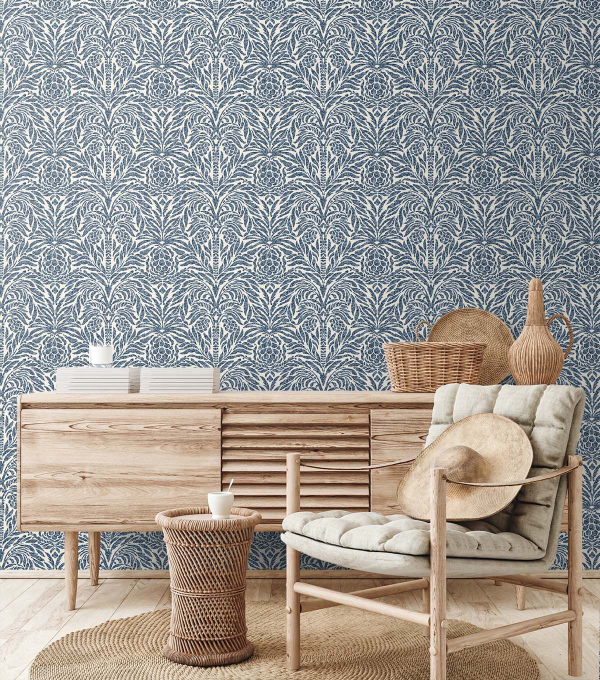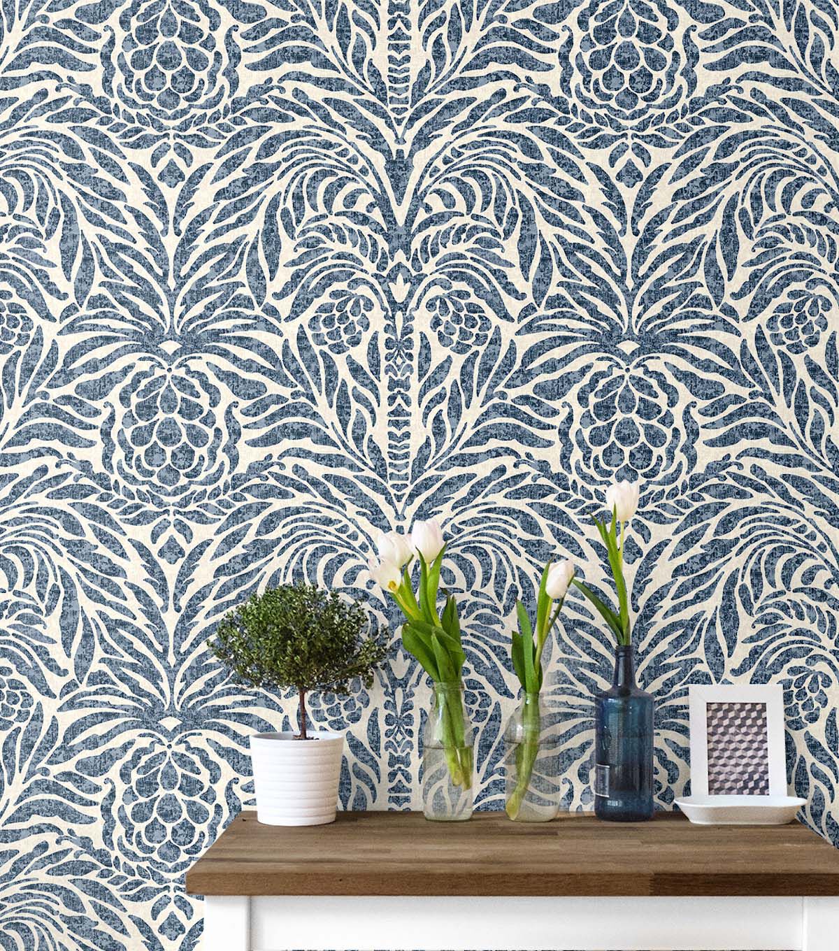 Tommy Bahama Bondi Batik peel wallpaper is an abstract damask featuring an interpretive rending of a palm tree and its adjacent pineapple. The beautiful palette complements the abstract forms with its inspired batik appearance. Transform an accent wall or an entire room easily with DIY friendly, ready to use Bondi Batik peel and stick wallpaper. Ideal for renters and homeowners alike. Repositionable and 100% removable without any sticky residue left behind.