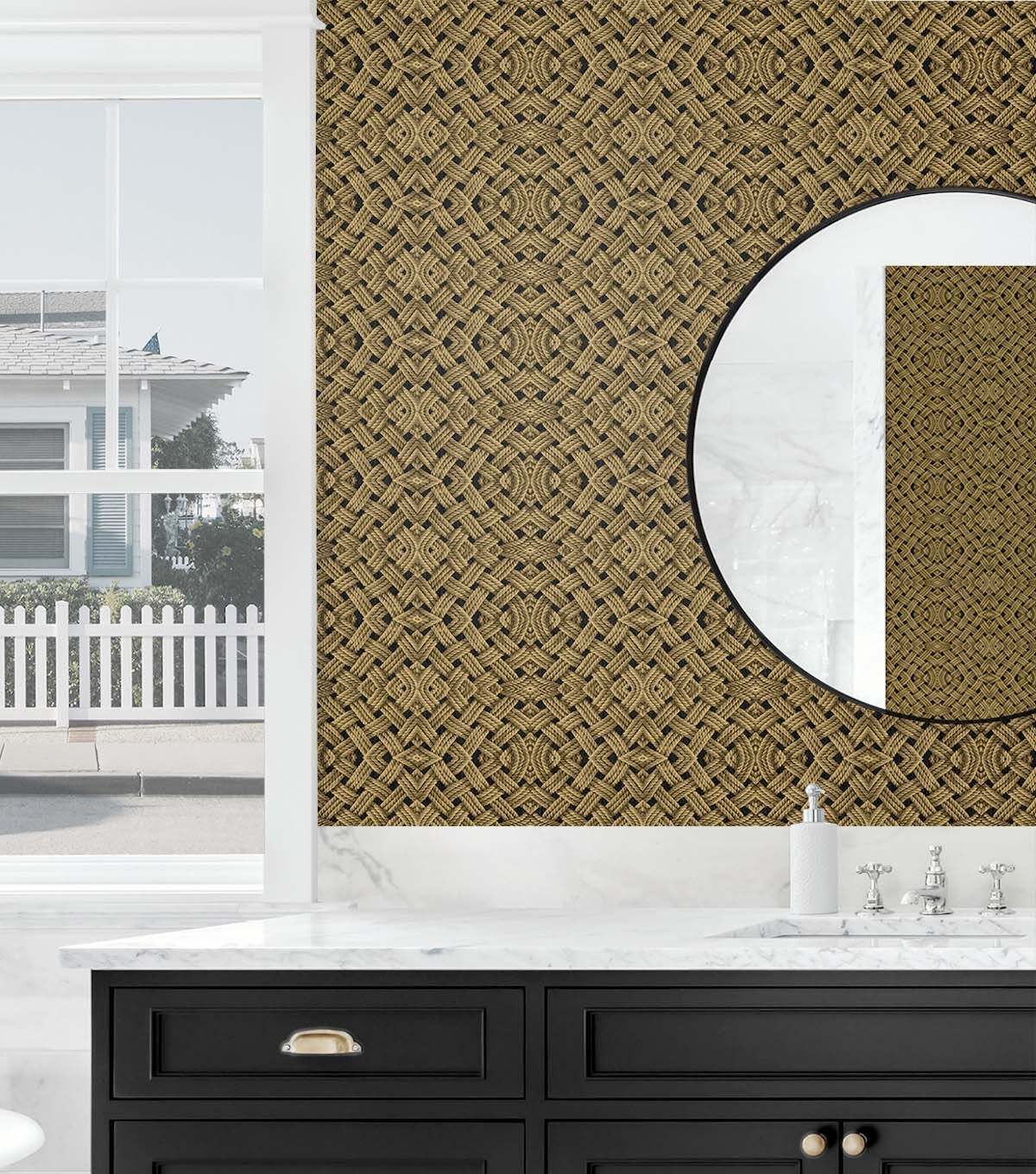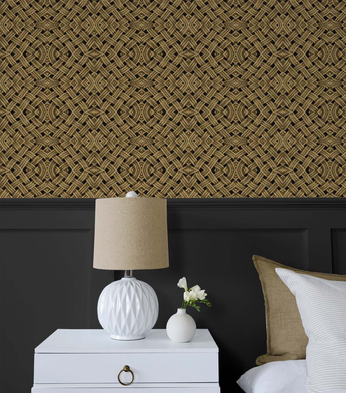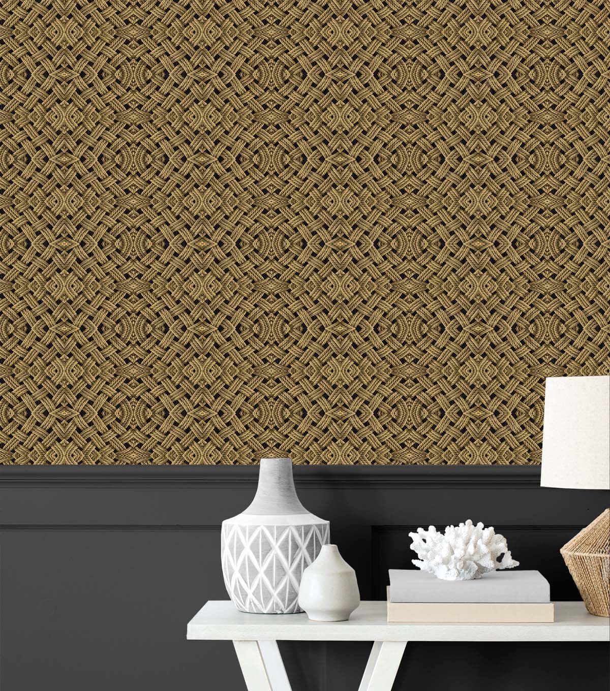 Ropes of jute and sisal twist and intertwine form a graphic modern motif of shifting forms and unexpected patterning. Tommy Bahama Offshore Sailor peel and stick wallpaper is reminiscent of the macrame done by sailors while out at sea. This textural, modern geometric with nautical feel is ready to use, easy to apply, repositionable and 100% removable. DIY friendly. Add dimensional interest to interior walls, furniture, and stair risers with Tommy Bahama Offshore Sailor peel and stick wallpaper. Made in the USA.