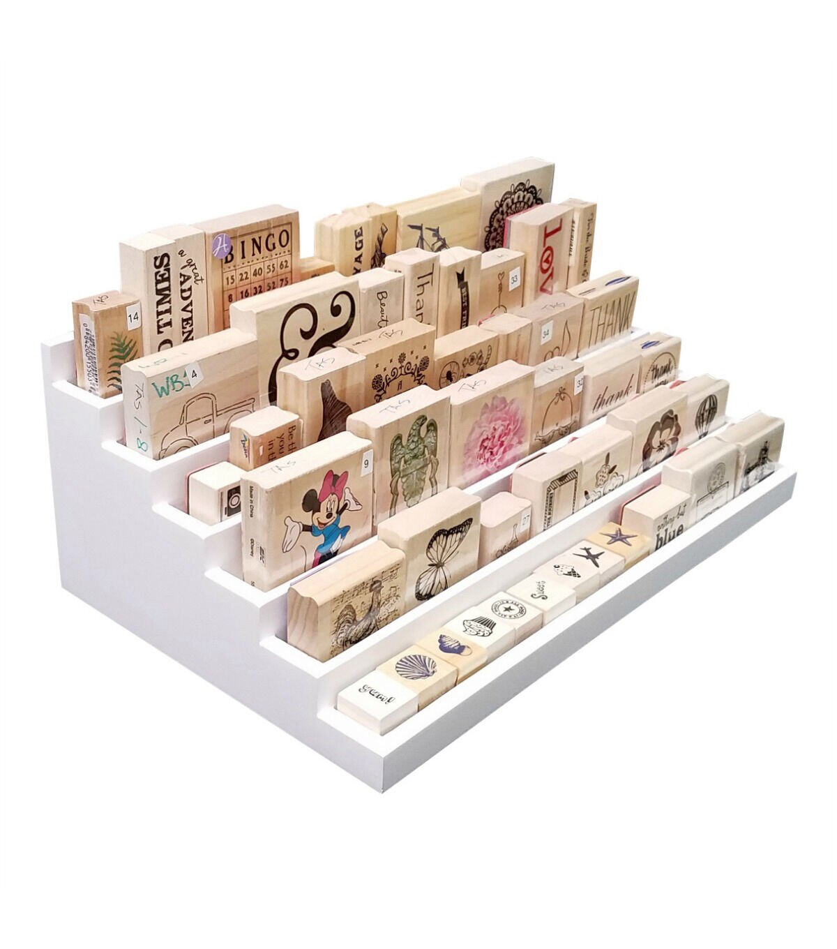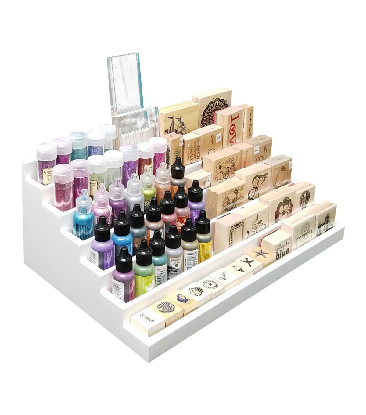 Get your wood mounted stamps, glitter glue, spools of thread, and washi tape organized using the 6 Level Stamp & Supply Stadium by Totally-Tiffany!