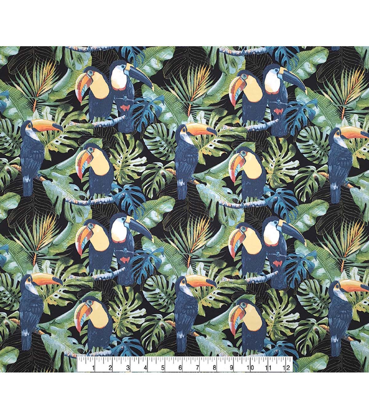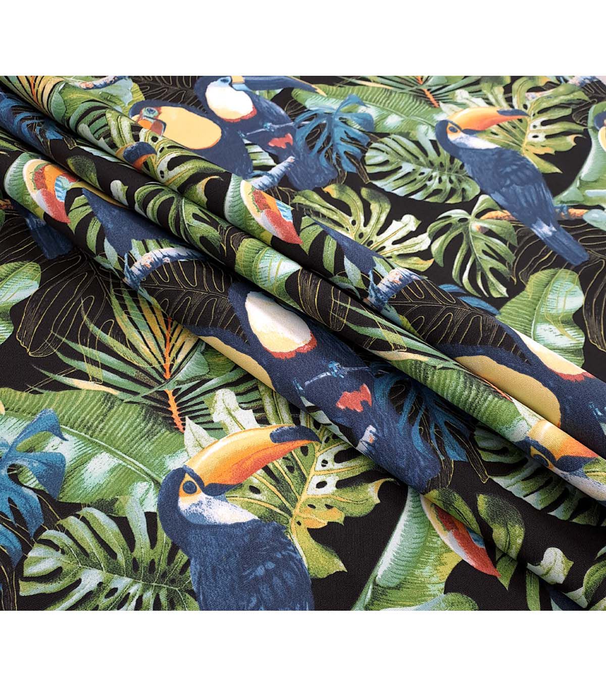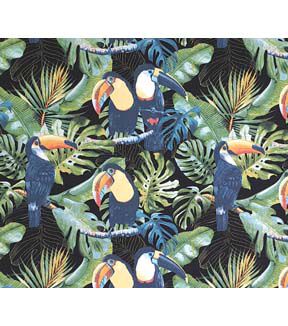 - Printed design featuring toucans on branches against a black background