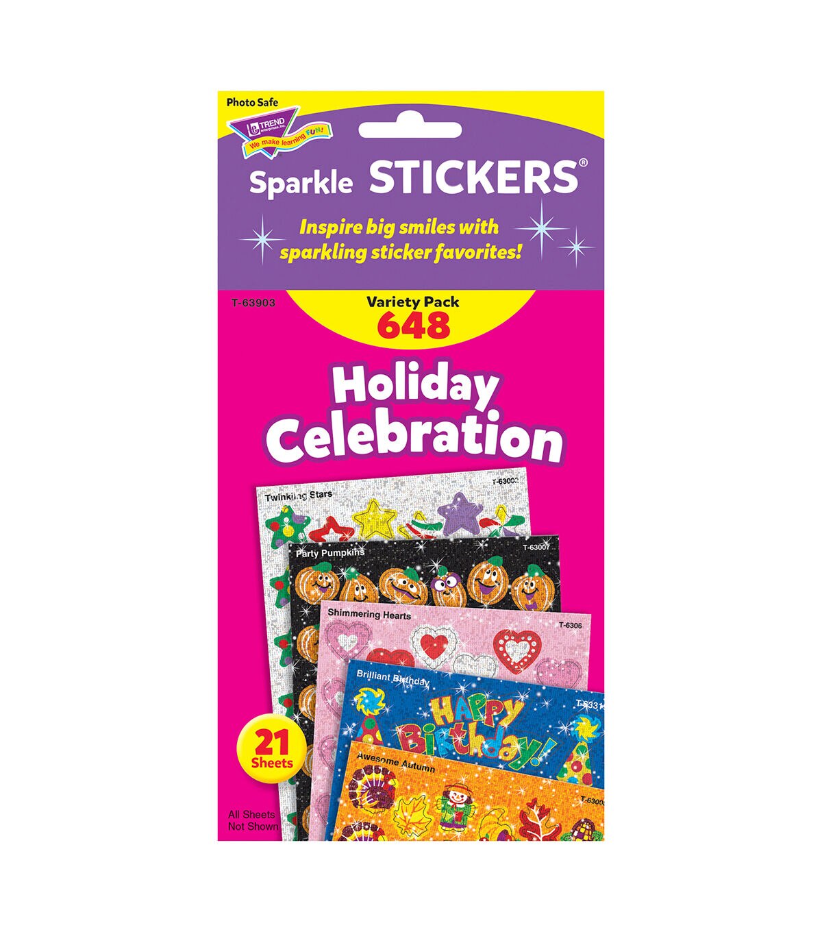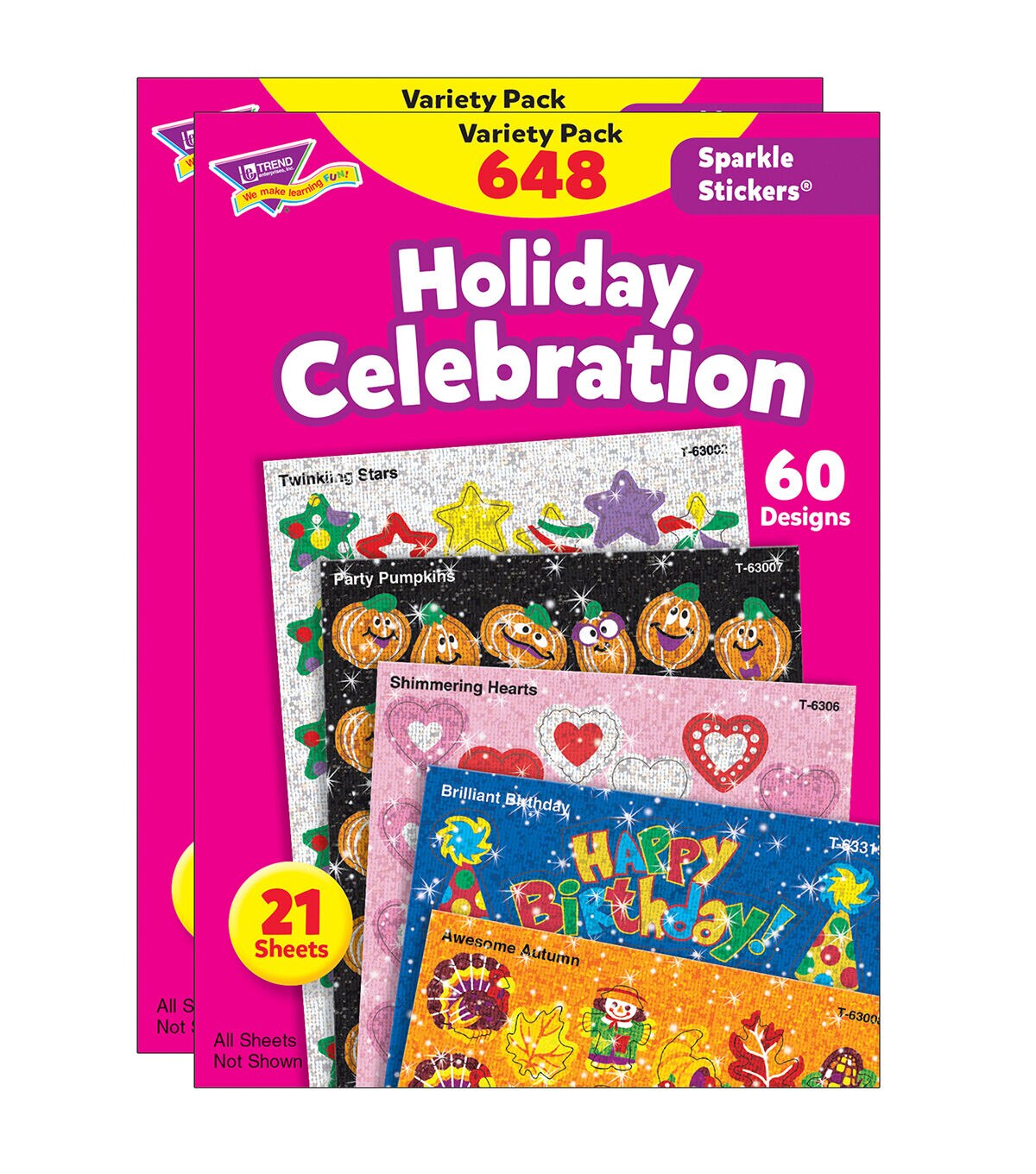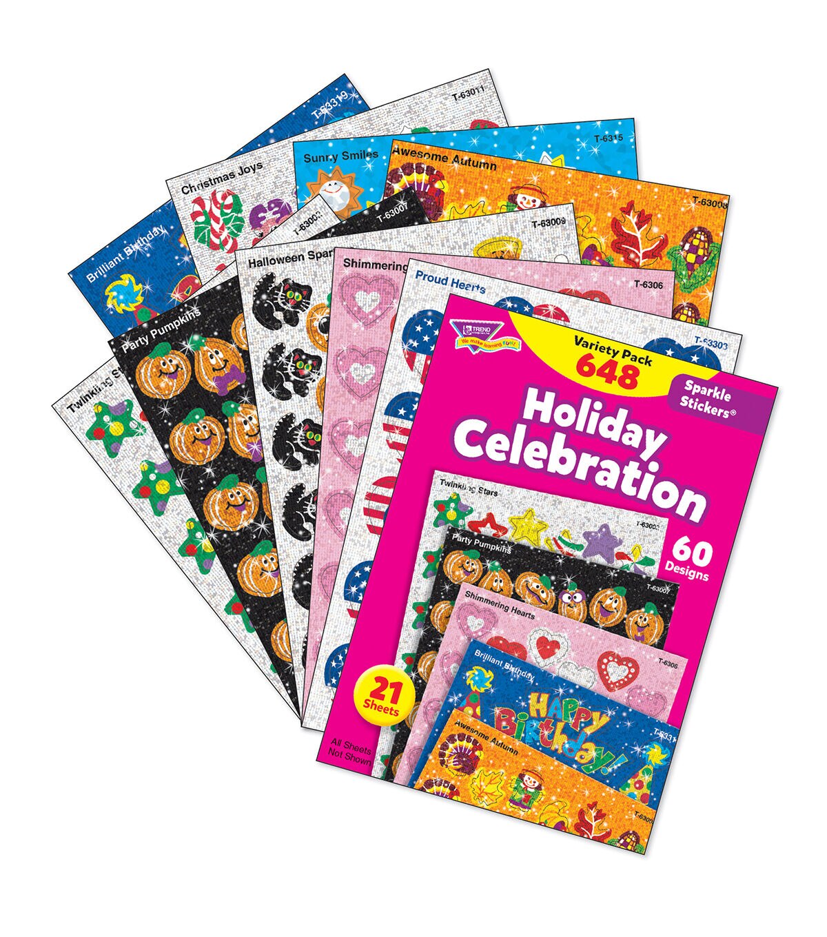 Little sparklers are a big hit with kids! They're just the right size to put on homework and reward good behavior. This variety pack includes Twinkling Stars, Party Pumpkins, Halloween Sparkles, Awesome Autumn, Christmas Joys, Brilliant Birthday, Sunny Smiles, Proud Hearts, and Shimmering Hearts. Stickers are acid free, nontoxic, and safe for use on photos. 60 designs, 648 stickers per pack. Sold as 2 packs for a total of 1296 stickers.