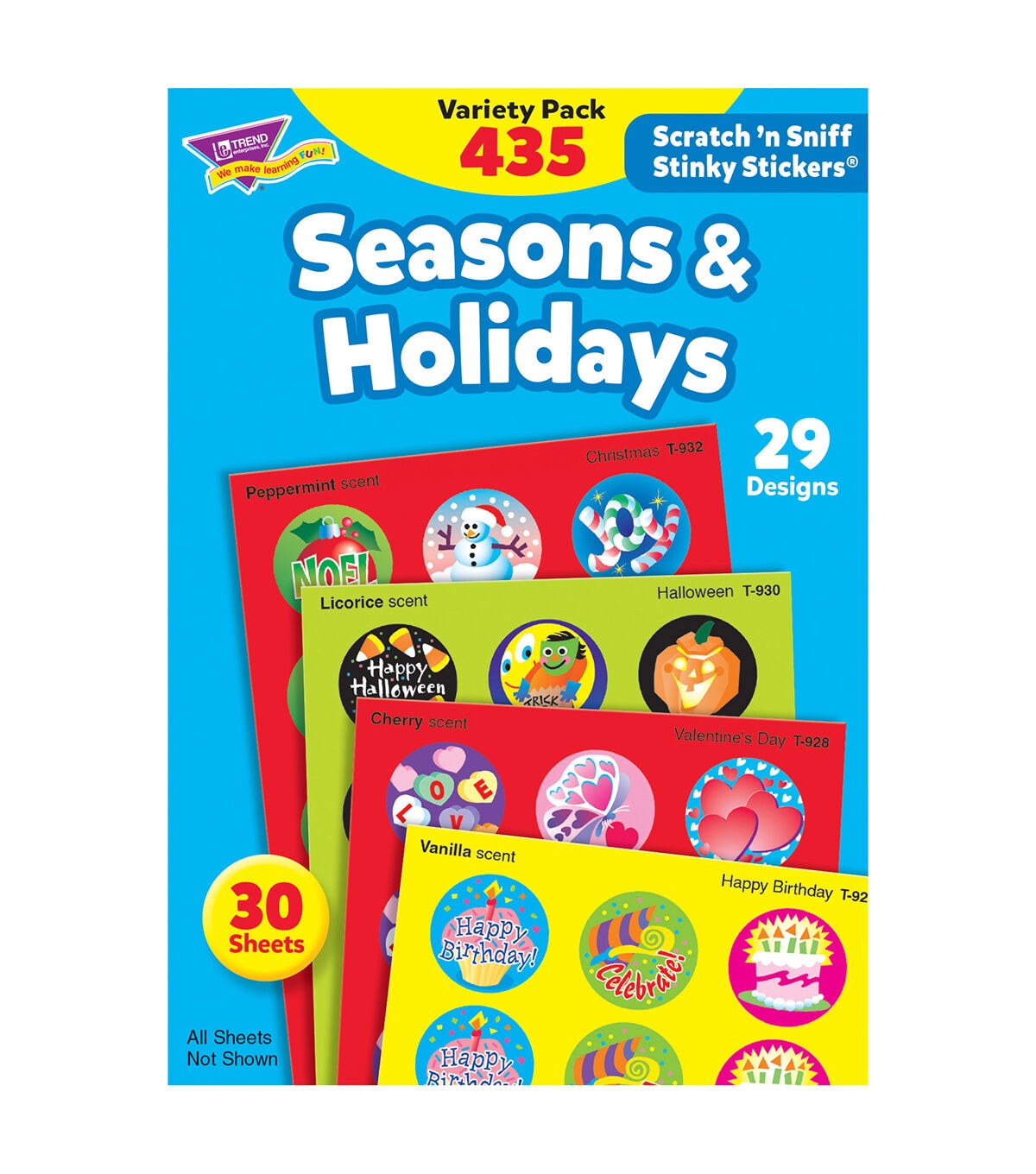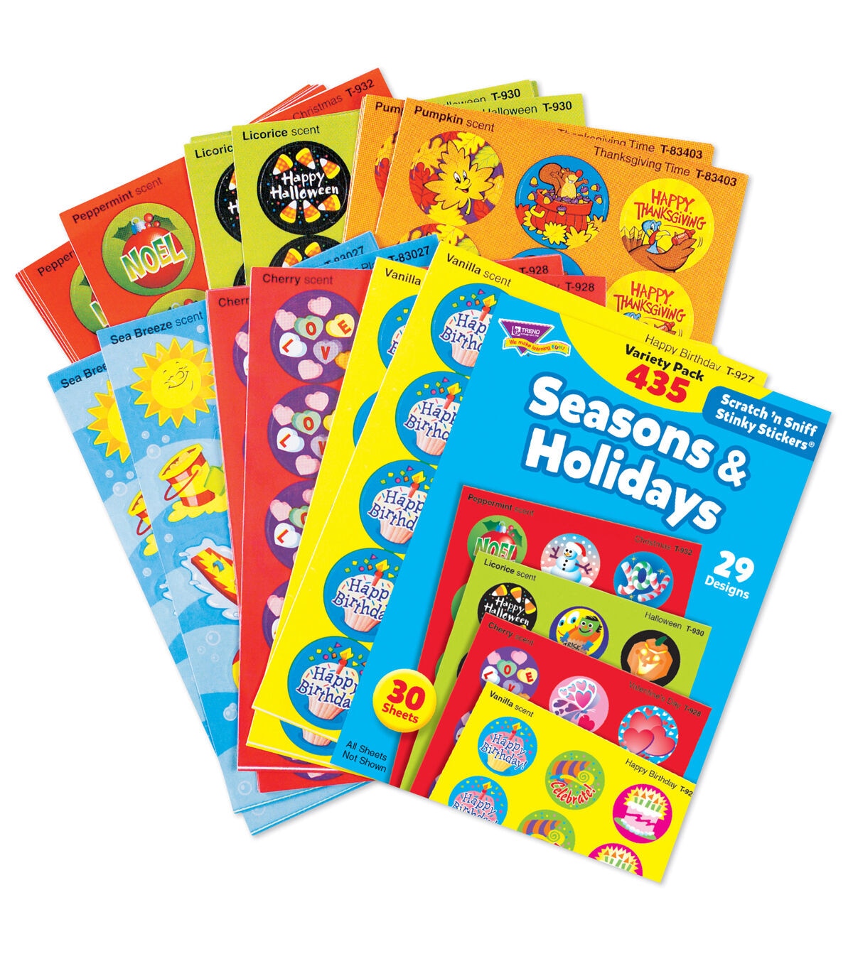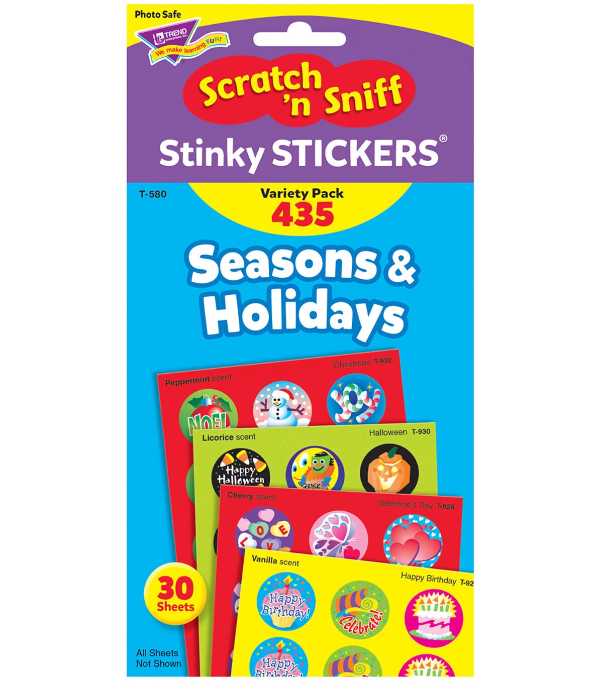 Everyone's favorite stickers, the TREND Scratch'n Sniff Stinky Stickers Variety Pack-Seasons & Holidays is fun to collect or can be used to motivate and reward. The designs include Happy Birthday, Valentine's Day, Water Play, Halloween, Thanksgiving Time and Christmas. These stickers are acid-free, non-toxic and photo safe.