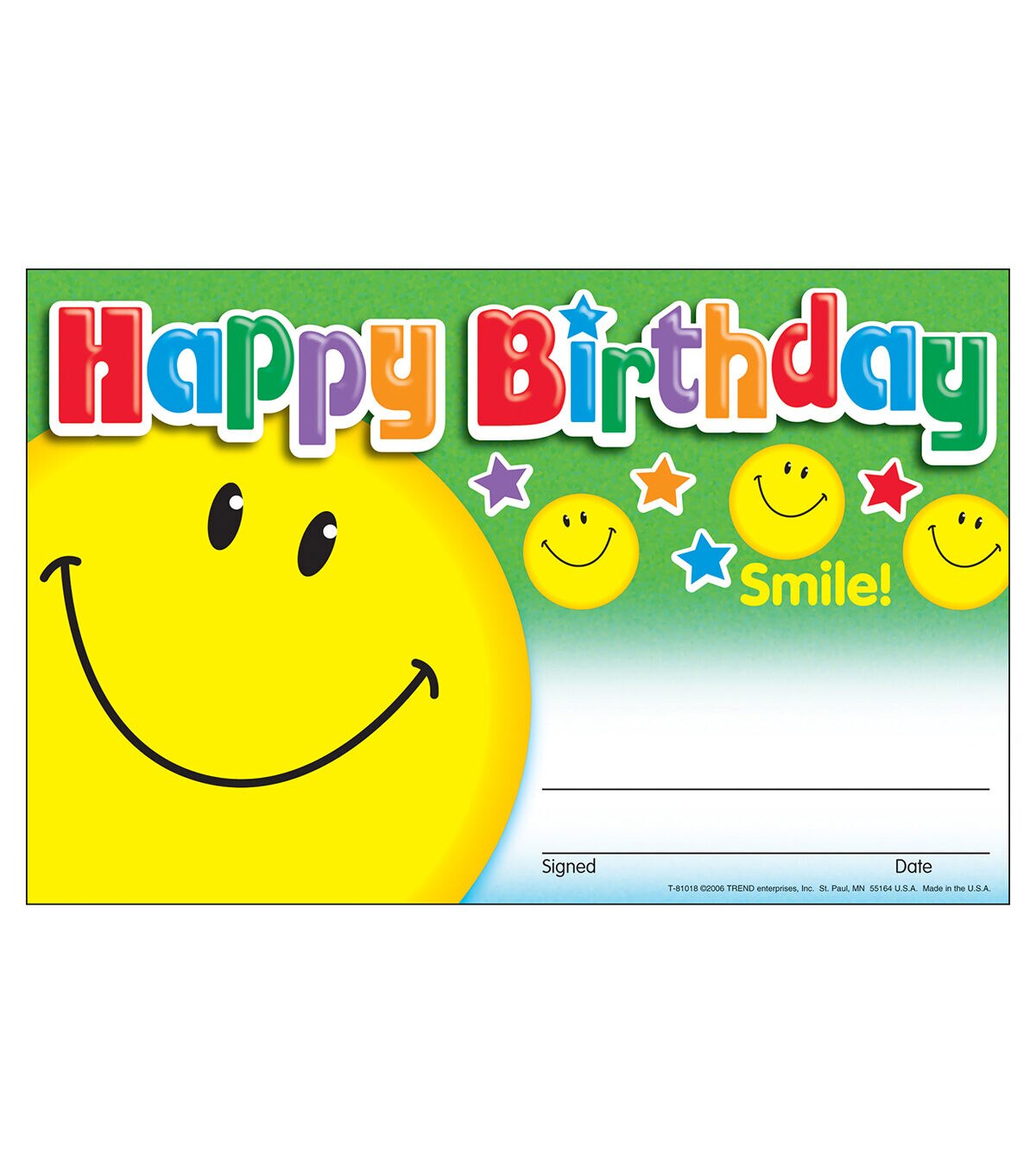 Kids will be proud to take home the TREND Awards-Happy Birthday Smile at birthday parties. They are easy to customize with personal messages, notes and praise. These have ample space for a child's name and personal message, plus your signature and date. Its vivid printing on thick paper stock will last for years. Use a permanent marker for best results. It's a great way to celebrate everyday accomplishments and big moments of success.
