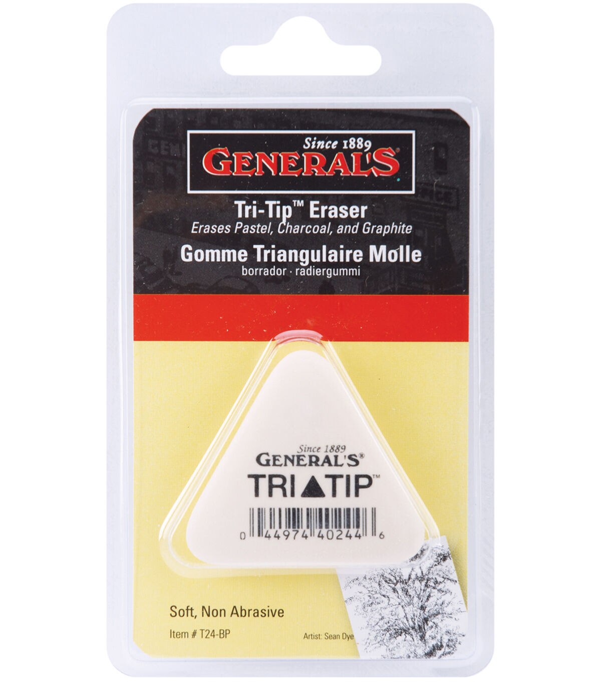 Ideal for erasing pastels and charcoal and will also erase graphite marks. Use the tips for erasing and also to create precise detailing. Perfect for artists of all ages. This package contains one 1-3/4x1-3/4x1/4in soft; non- abrasive triangular eraser. Imported.