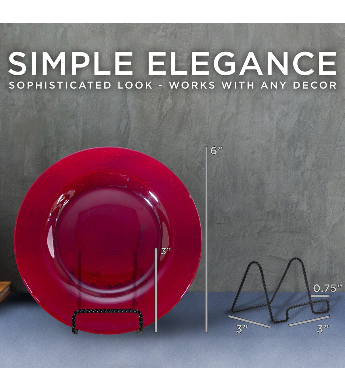 Show off your favorite home decor with a small, black, 3" double twisted wire stand. The double twisted metal stand is a bold and sturdy piece to be used throughout the home for plates, artwork, framed photographs and much more. The easel is handcrafted with two wires twisted together then welded in one spot, creating a moving effect. Perfect for plates, tiles, art, framed photographs and books. Looks great on shelves, tables, desks, counters and more. 3/4" lip depth. Fits items 4"-7"