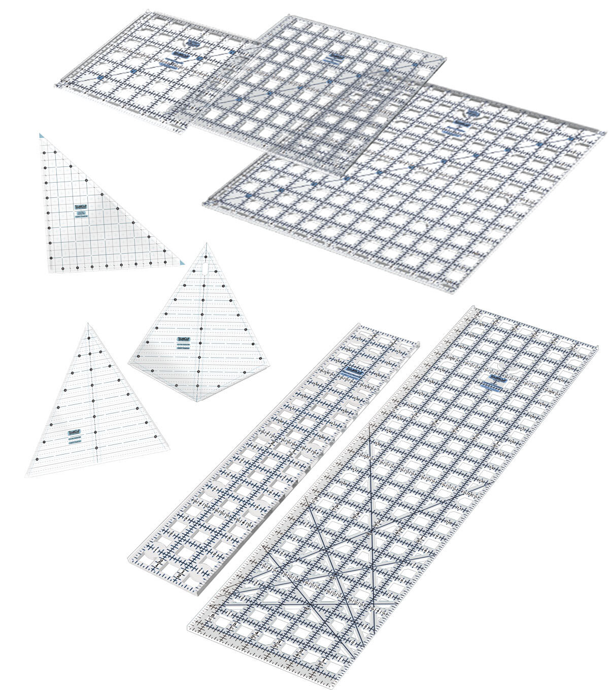 If you want to try all the different kinds of rulers that TrueCut has to offer, this bundle is for you! With two rectangle rulers, three square rulers, and three triangle rulers, you’ll have options to do virtually any kind of measuring and cutting. The traditional rectangular quilting rulers are perfect for just about every project, especially precise measurements and cutting strips. Square rulers are great for cutting shapes like triangles and stars, and the triangle rulers are best for small shapes and pieces. Includes: 6.5 x 24.5" Ruler, 3 x 18” Ruler, 6.5 x 6.5” Ruler, 9.5 x 9.5” Ruler, 12.5 x 12.5” Ruler, Right Triangle Ruler, Kite Ruler, and Equilateral Ruler