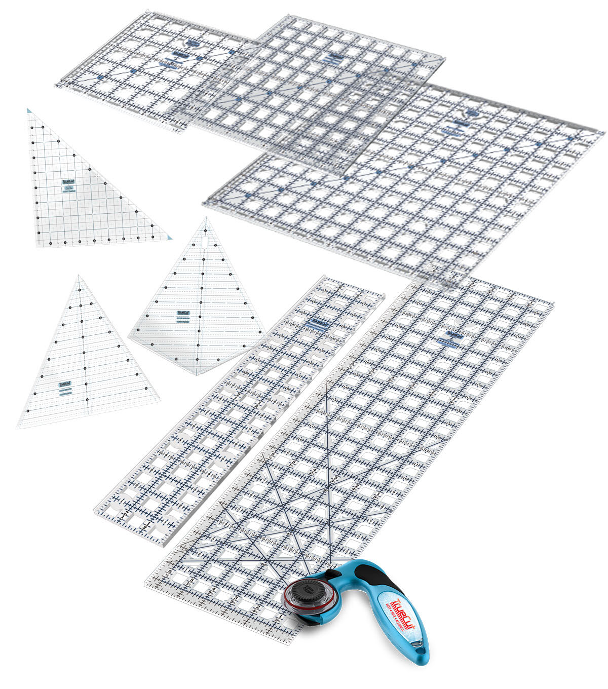 If you want to try all the different kinds of rulers that TrueCut has to offer, this bundle is for you! With two rectangle rulers, three square rulers, and three triangle rulers, you’ll have options to do virtually any kind of measuring and cutting. The traditional rectangular quilting rulers are perfect for just about every project, especially precise measurements and cutting strips. Square rulers are great for cutting shapes like triangles and stars, and the triangle rulers are best for small shapes and pieces. The My Comfort Cutter rotary cutter is ergonomically designed to relieve stress in your hand and wrist for pain-free cutting. The cutter guide and ruler track interlock, giving you straight cuts every time and preventing the cutter from slipping or veering off. Includes: 6.5 x 24.5" Ruler, 3 x 18” Ruler, 6.5 x 6.5” Ruler, 9.5 x 9.5” Ruler, 12.5 x 12.5” Ruler, Right Triangle Ruler, Kite Ruler, Equilateral Ruler, and a 45mm My Comfort Cutter