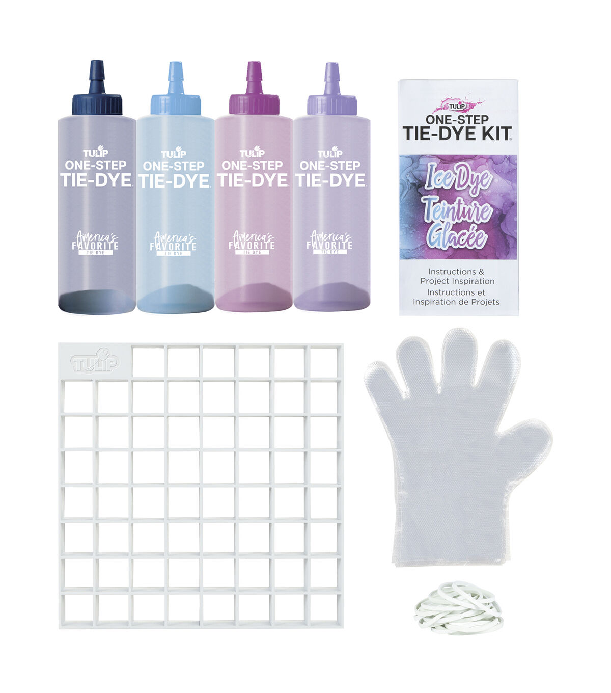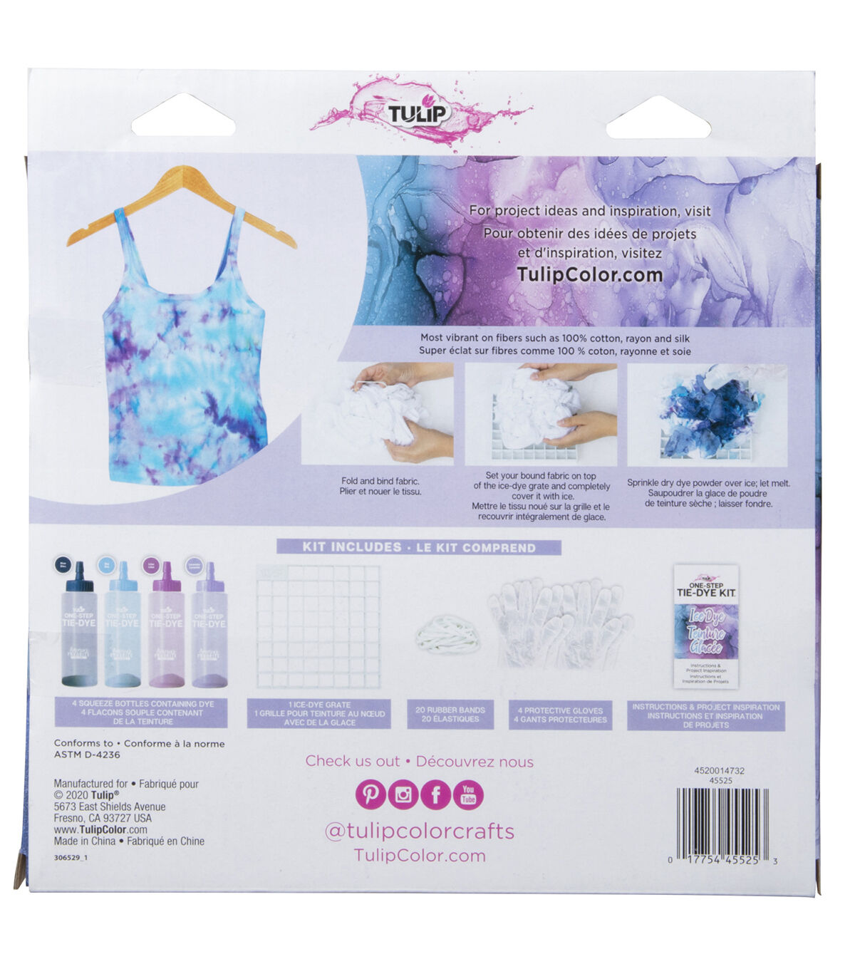 Create super cool tie dye effects with the Tulip Ice Dye One Step Tie Dye Kit! This easy to use tie dye kit comes with the tools and special instructions you need for your colorful ice tie dye experience. Stocked with four 2.75 oz. dye bottles containing One Step Dye powders (blue, sky, lilac and lavender), plus an ice dye grate, rubber bands, protective gloves, and an inspiration guide. Just add ice and let it melt for watercolor tie dye effects you can mix & match with other tie dye looks. No two projects are ever alike! Great for totally unique tie dye experiences and gift giving too.