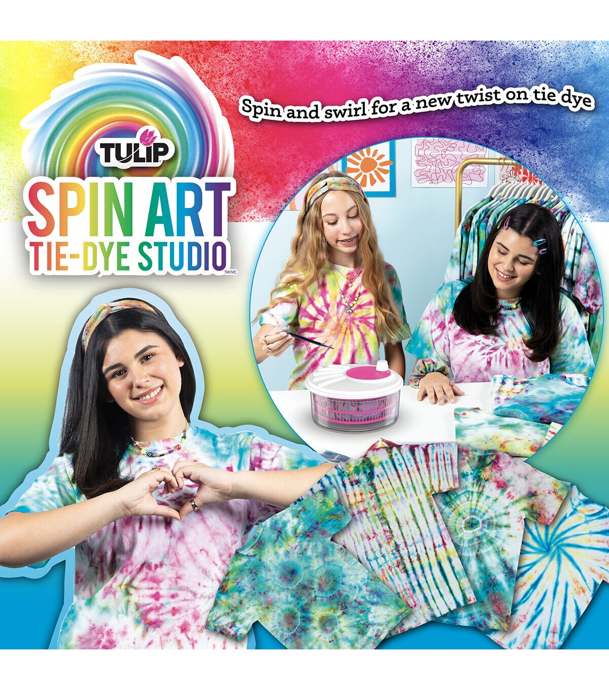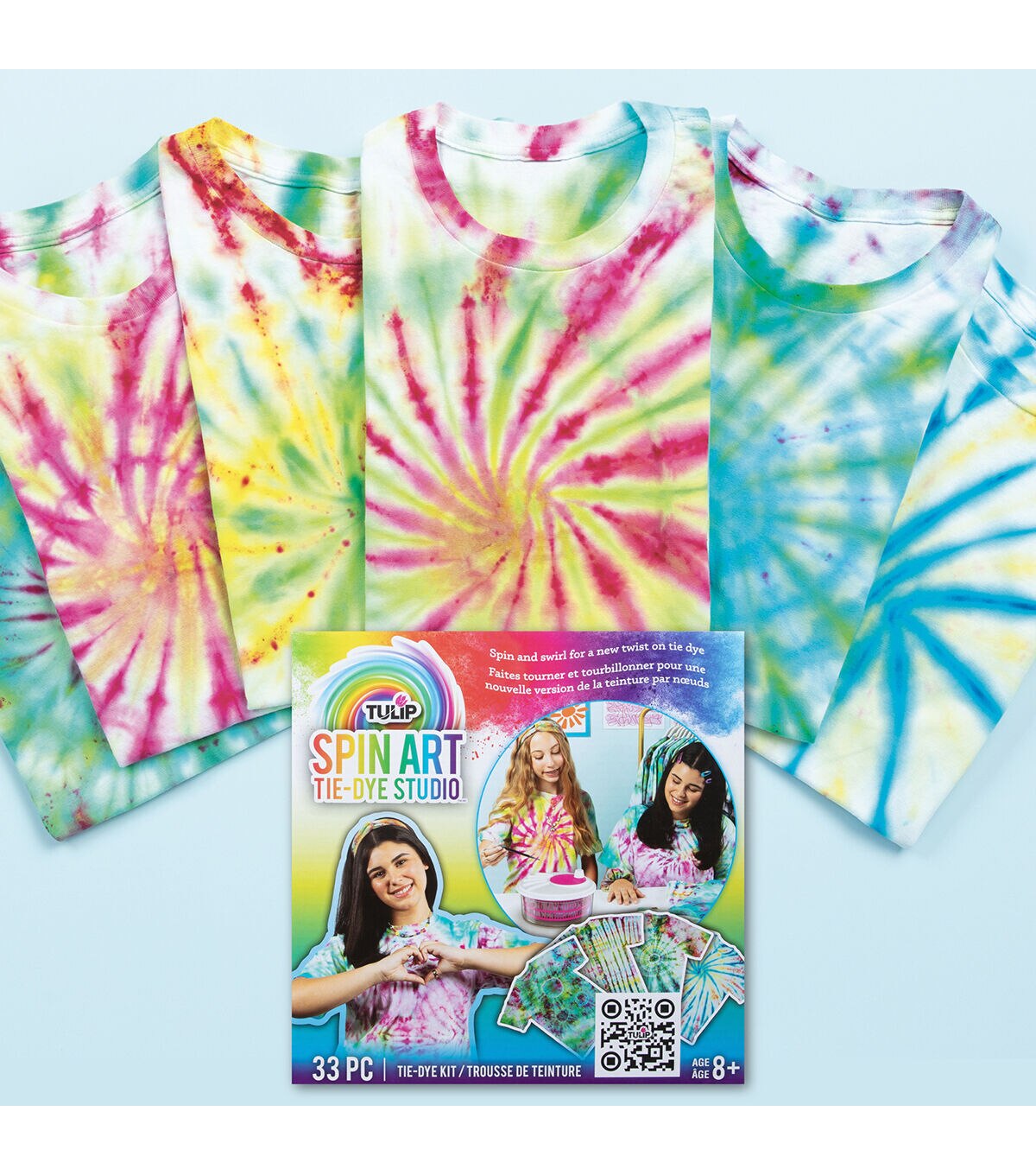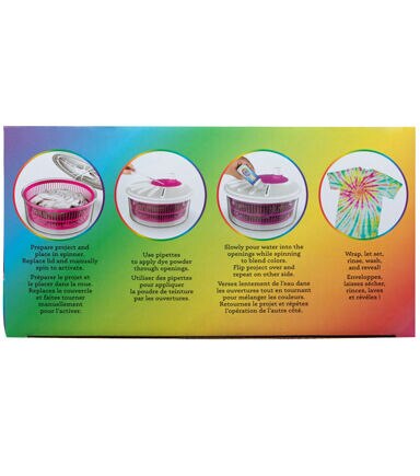 Spin and swirl for a new twist on tie dye with Tulip’s Spin Art Tie-Dye Studio! Kit includes 6 packets of One-Step Dyes (2 each: Fuchsia, Yellow, Turquoise) plus 6 gloves, 15 rubber bands, 3 pipettes, empty squeeze bottle, spin art machine, and project guide. Color placement will be unique every time— every project is a surprise! All Tulip One-Step Dyes are nontoxic and safe for crafters of any age or experience level. One-Step Dyes are formulated to be their best and brightest on natural-fiber fabrics. Dyes are safe to machine wash – colors stay bold through repeated washings.