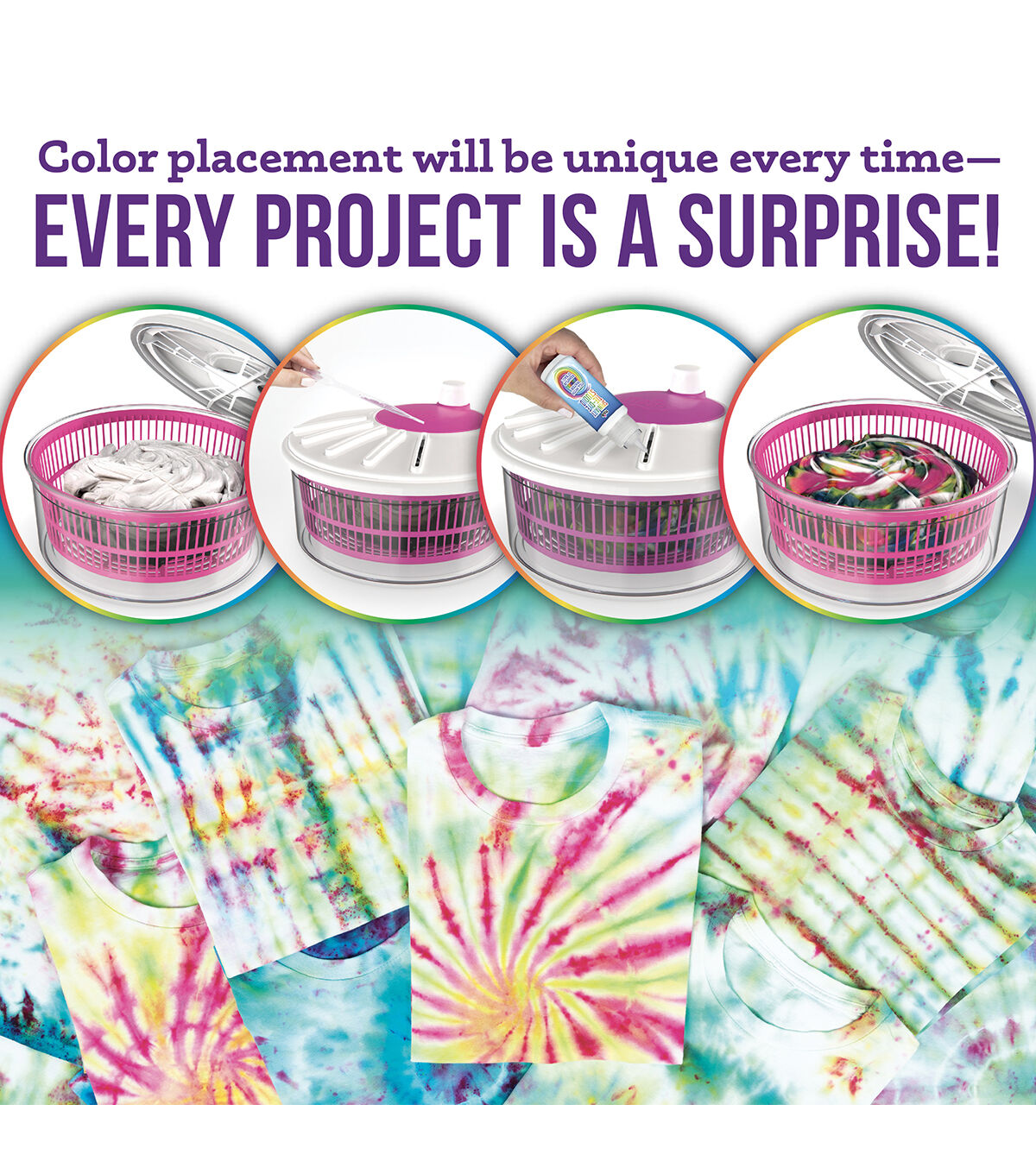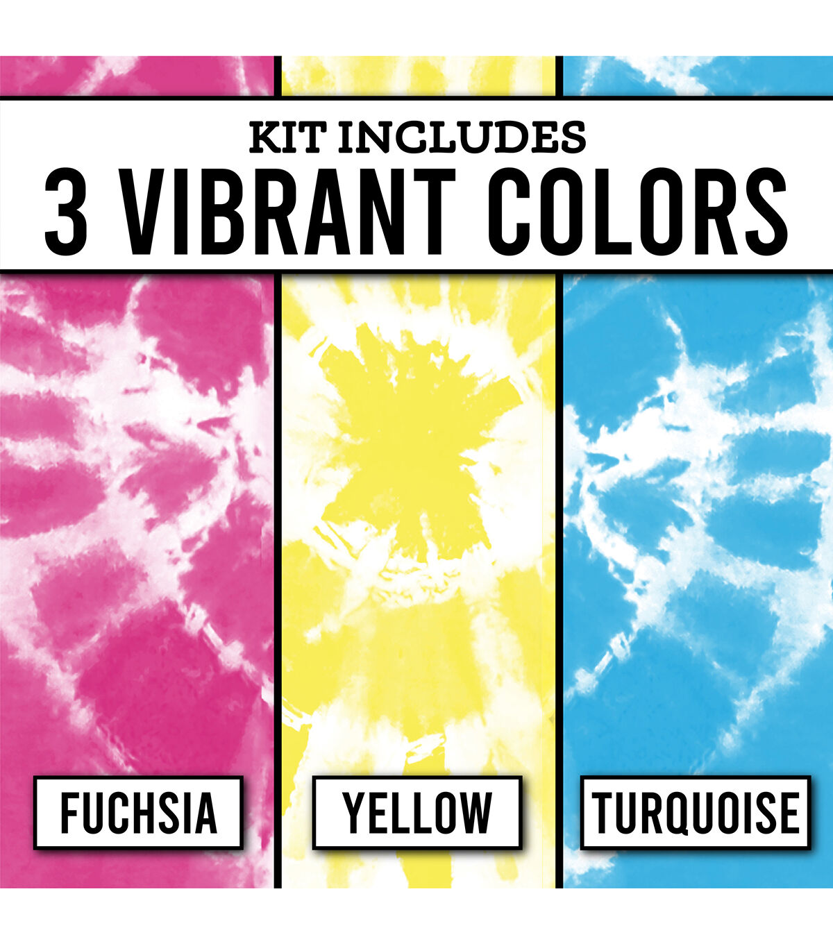 - Includes 6 packets of One-Step Dyes, 6 plastic gloves, 15 rubber bands, 3 pipettes, empty squeeze bottle, spin art machine, and project guide