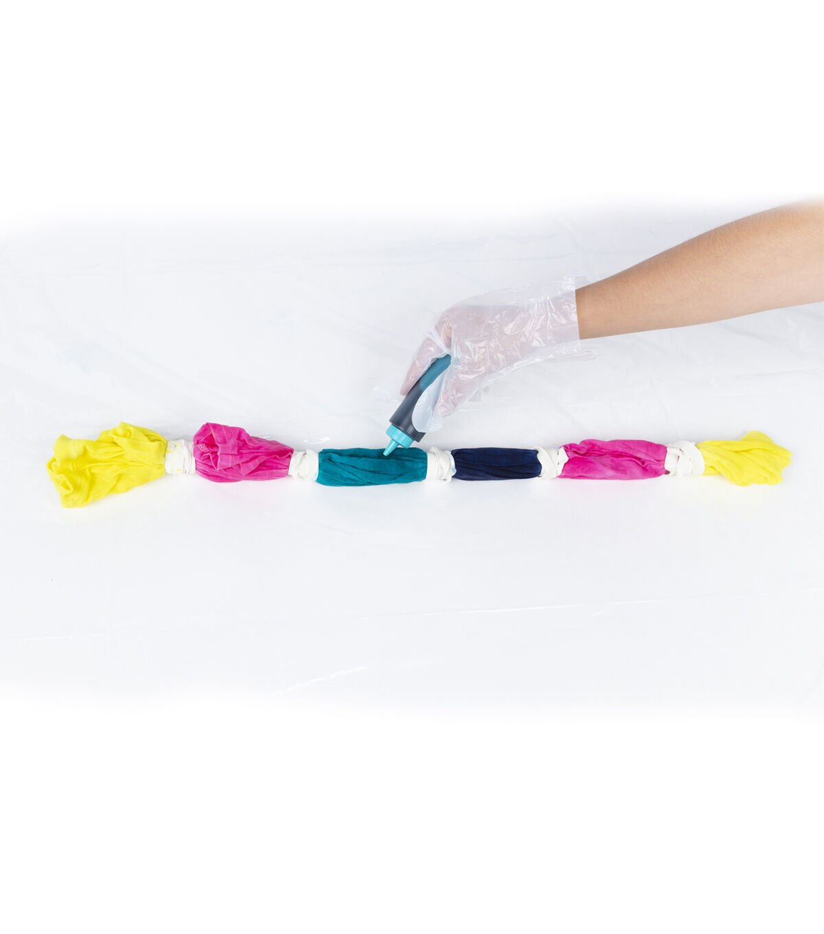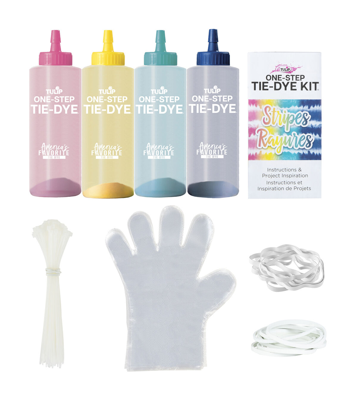 - Includes: 3 bottles of One-Step Dyes, 10 zip ties, 10 regular rubber bands, 10 extra-large rubber bands, and 4 plastic gloves (2 pairs)