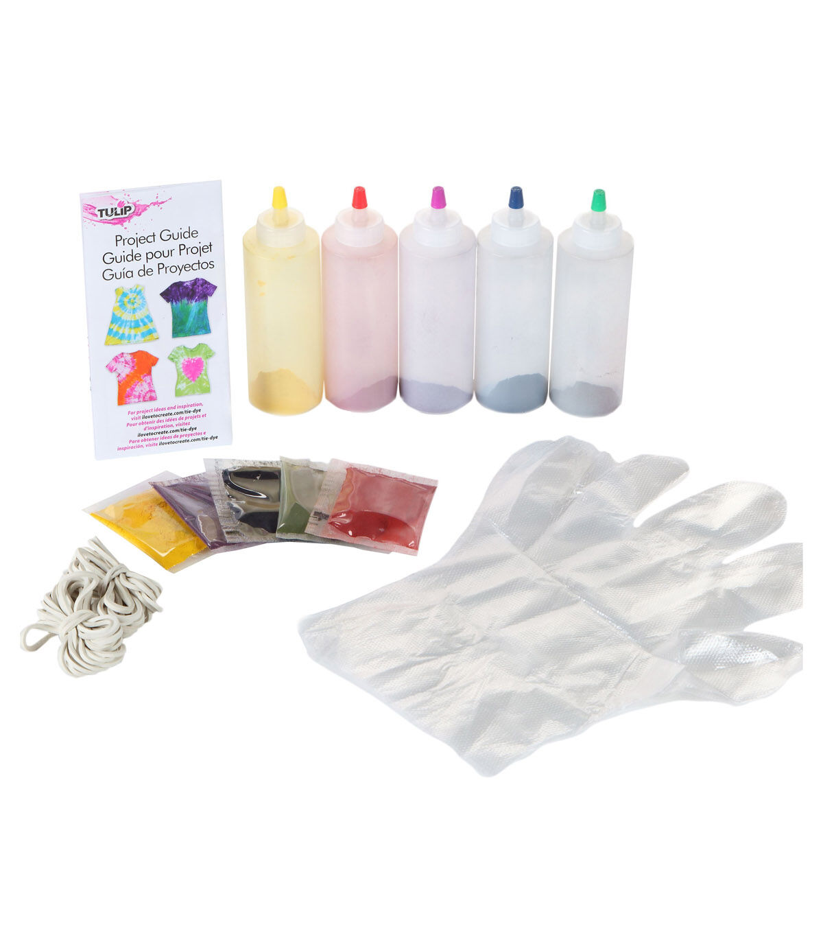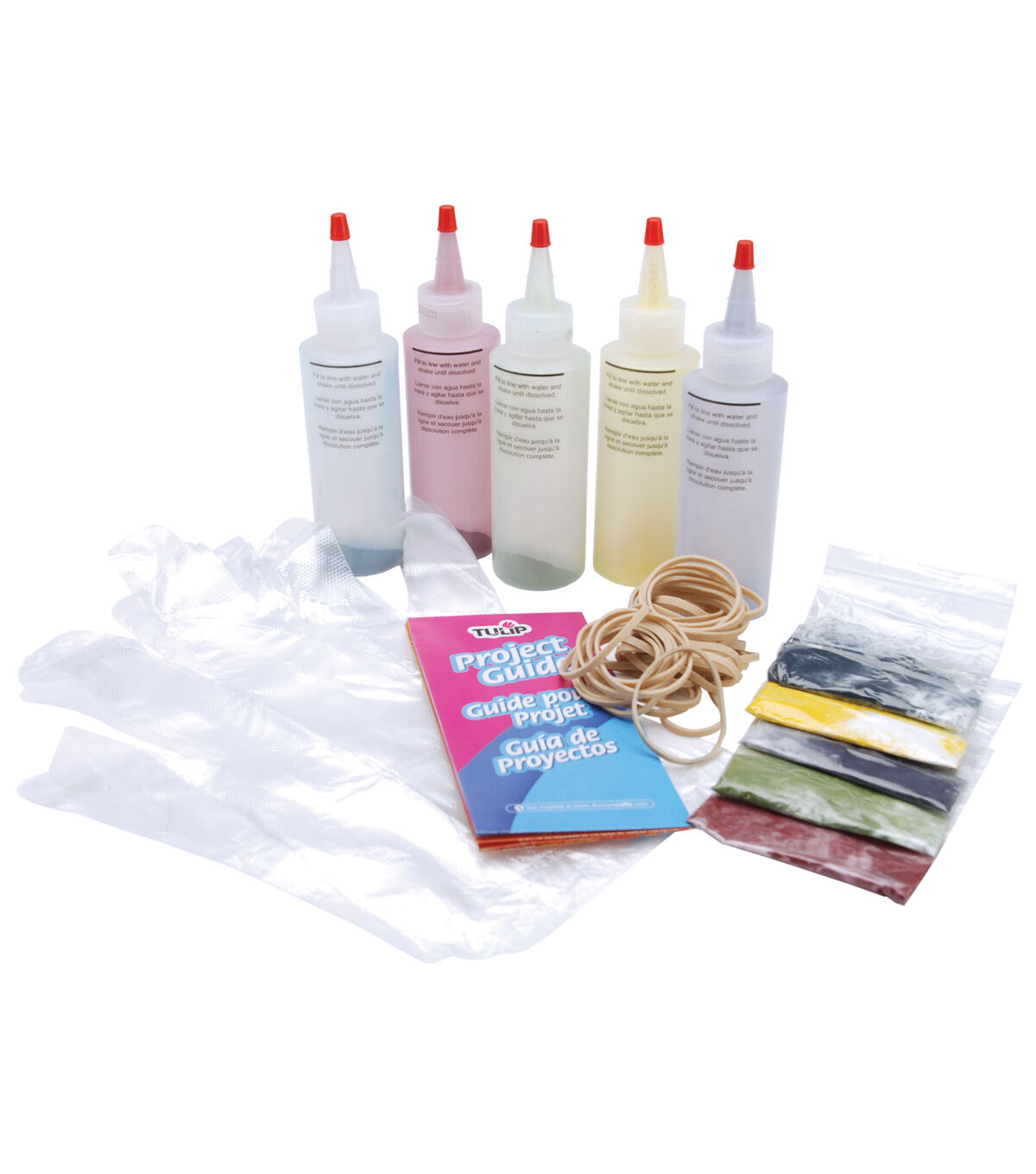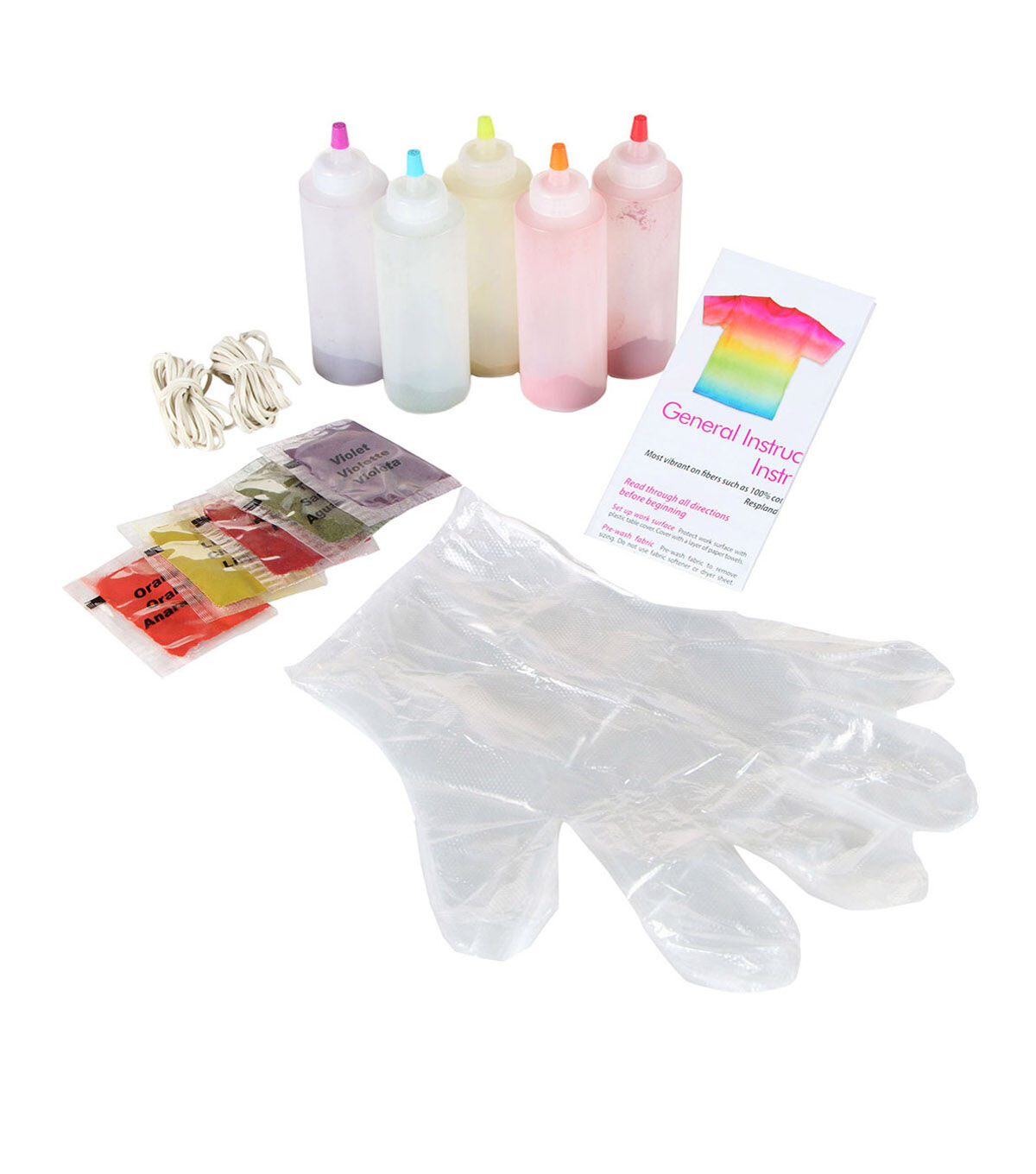 - Contains 5 - 4 oz bottles of dye, 5 dye refill packets, 8 protective gloves, 40 rubber bands and project ideas