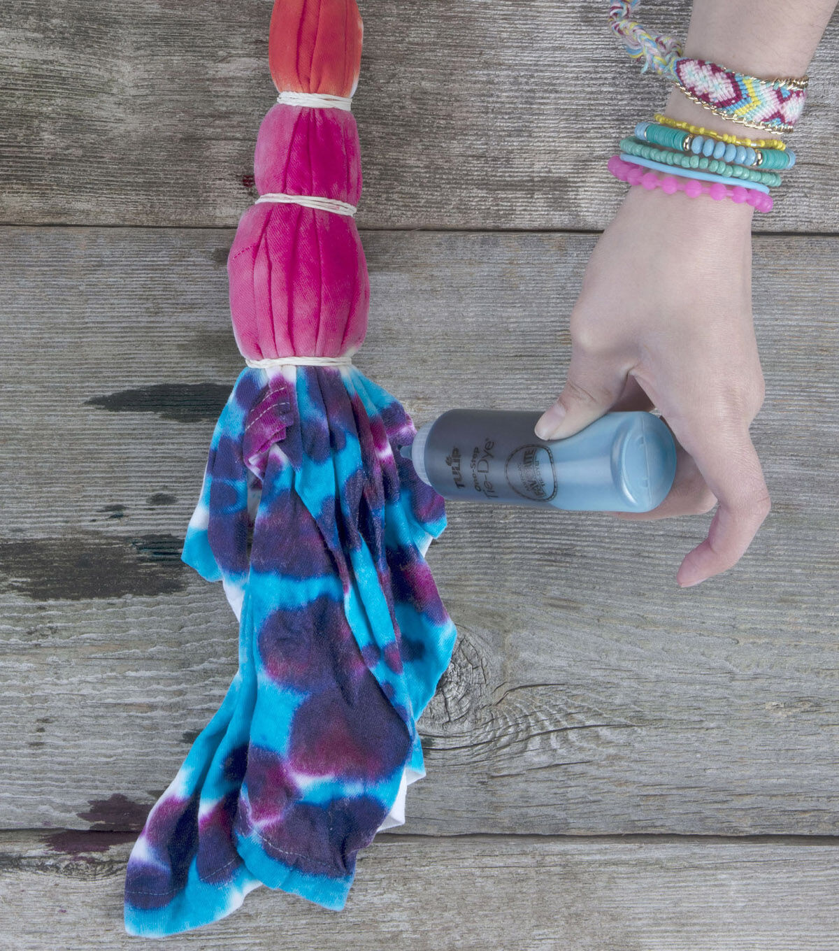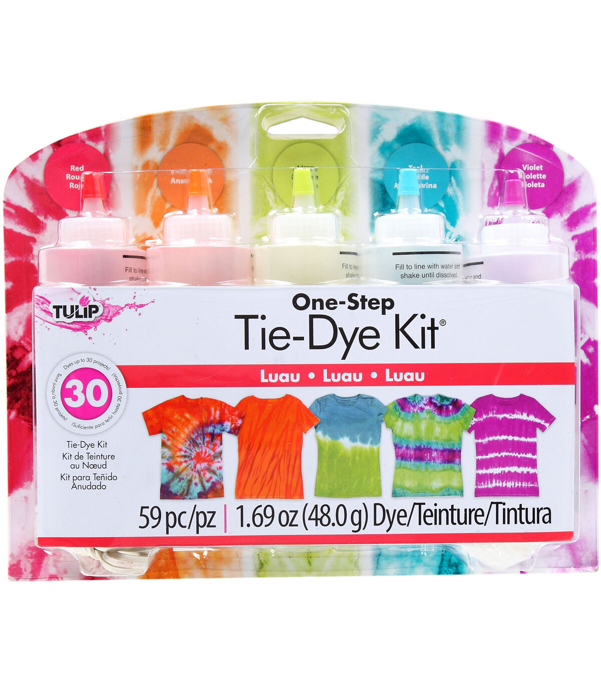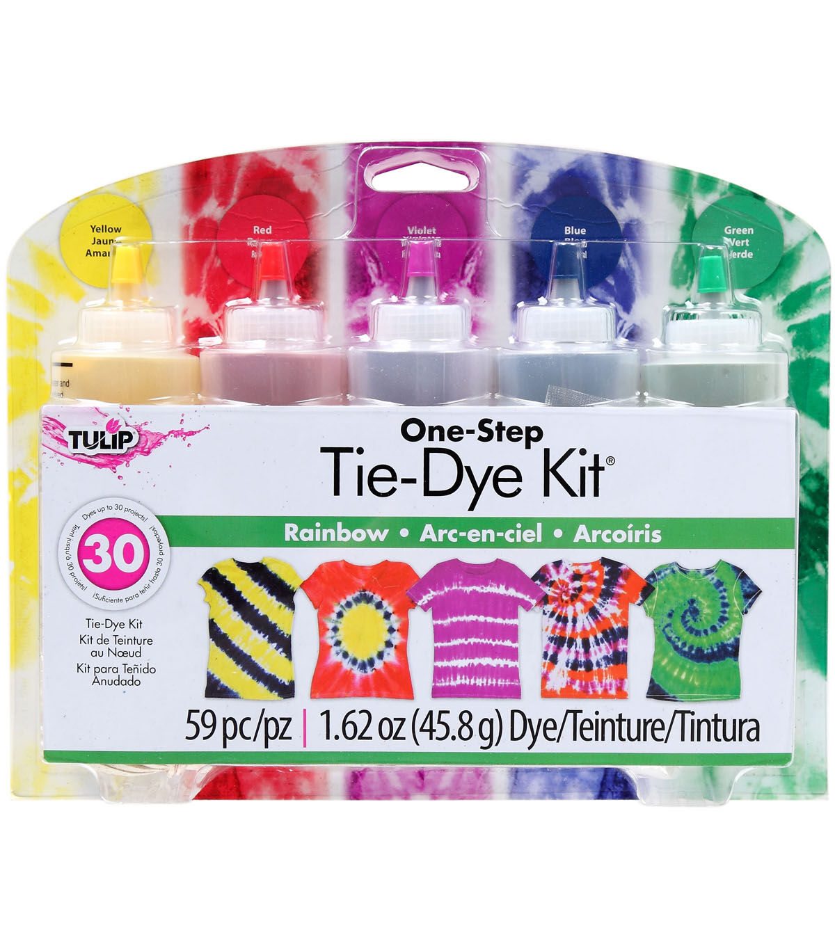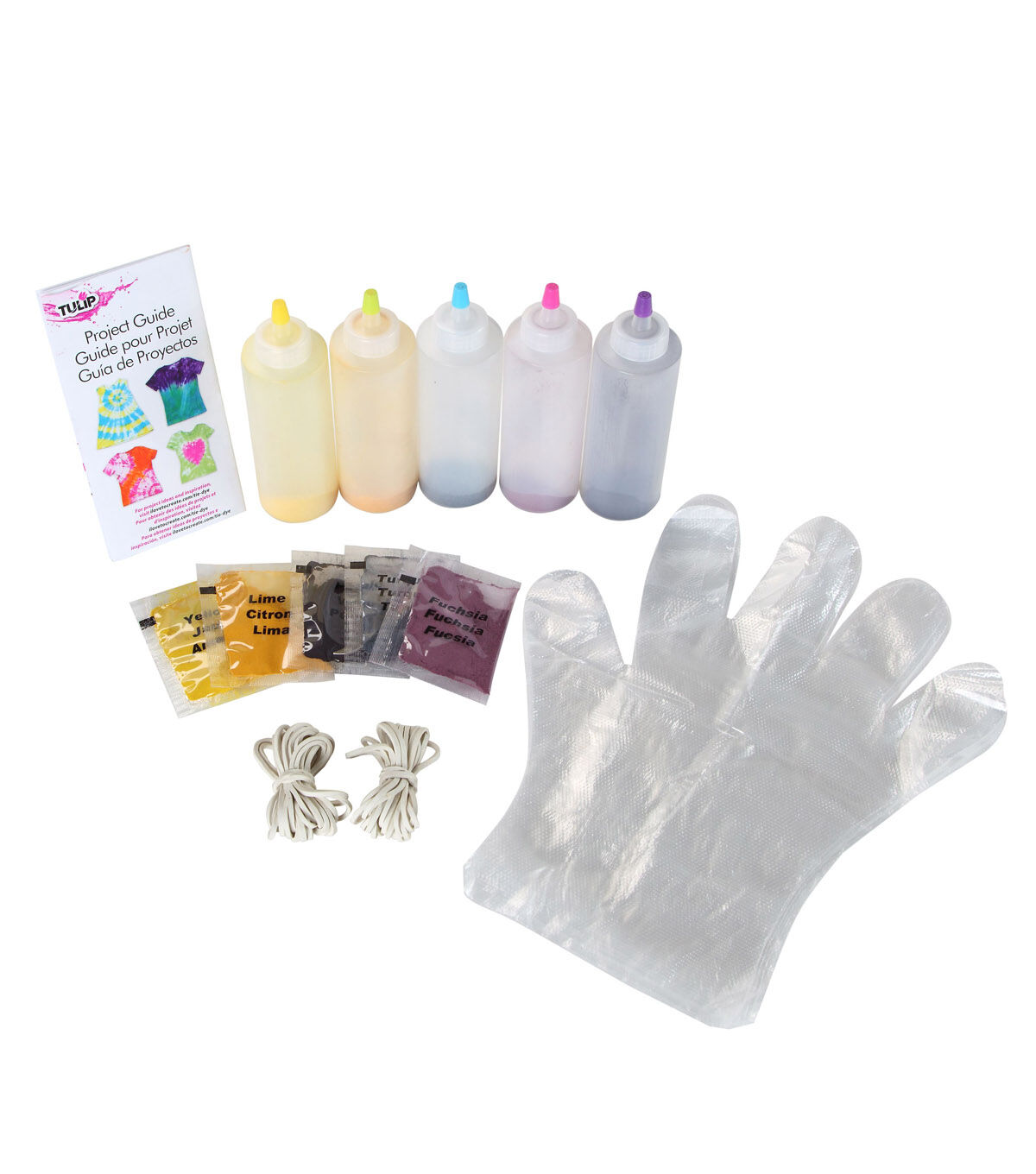 - Contains 5 - 4 oz bottles of dye, 5 dye refill packets, 8 protective gloves, 40 rubber bands and project ideas