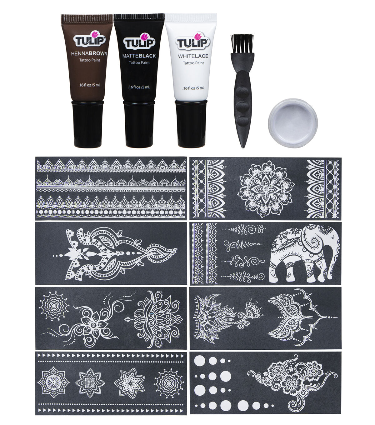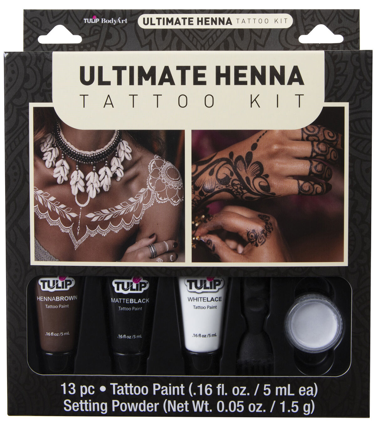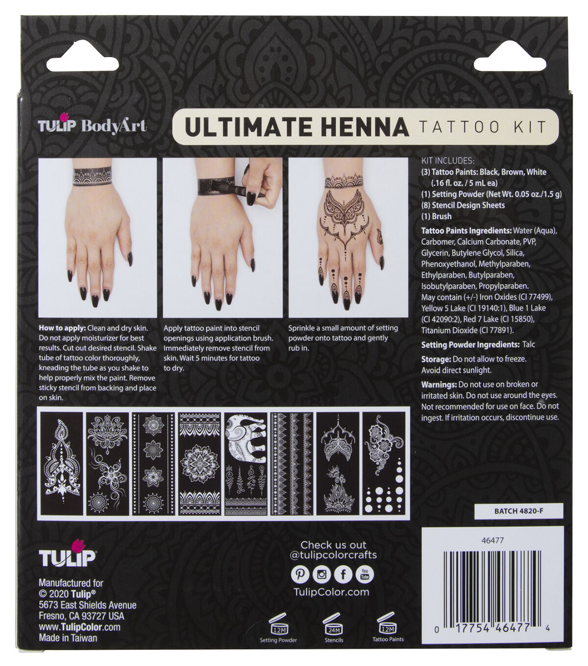 Turn yourself into a work of art with the Tulip Body Art Ultimate Henna Tattoo Kit! Enjoy the intricate beauty of henna body art with the easy two step application process that only takes minutes for long lasting effects. Kit includes 8 high definition stencils for hands and body, tattoo paints in brown, black and white, a brush and setting powder. Tattoo paints feature a precision tip for freehand design creation. Perfect for celebrations, gift giving and everyday wear.