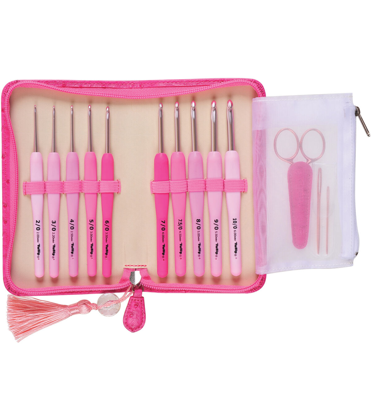 - Includes ten crochet hooks; scissors, yarn needles and case with tassel