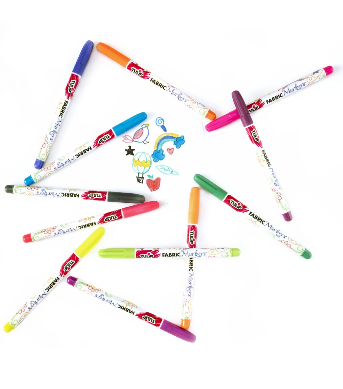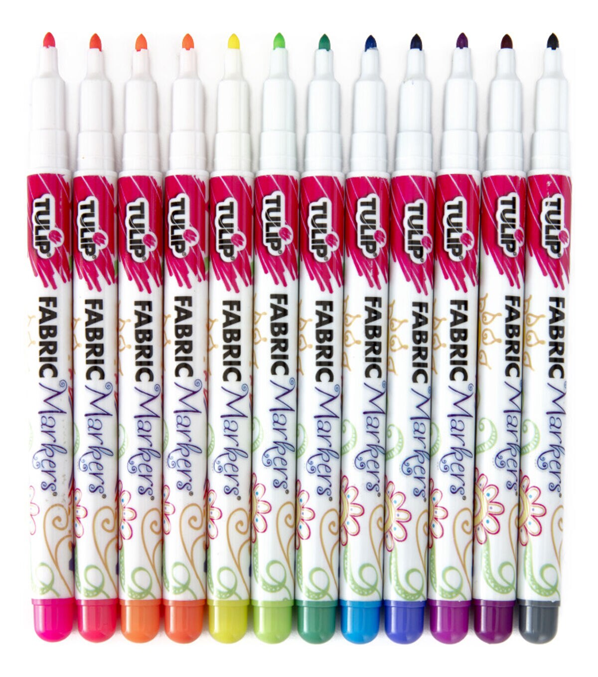The Tulip Fabric Markers Neon 12 Pack contains 12 fine-tip fabric markers fabric markers in a must-have palette of electric neon colors for coloring, doodling and writing on fabric. These fabric markers are nontoxic and permanent without heat setting, making them fun and easy to use for all ages.