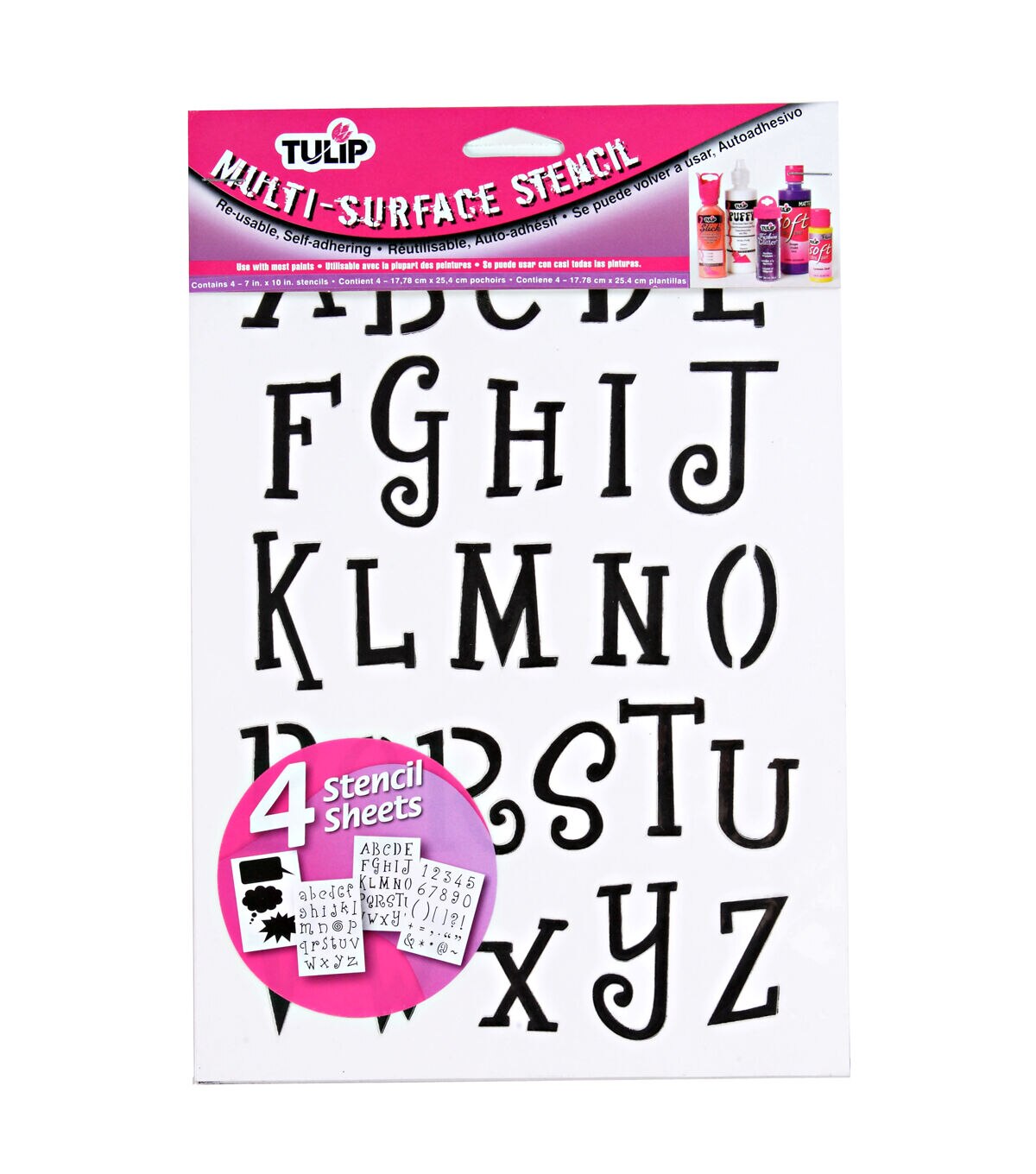 Tulip® Multi-Surface Stencils™ are self-adhering and reusable. Simply remove the backing from stencil, press in place, apply color to the surface and peel the stencil off. Then, rinse and re-use. Design made easy!