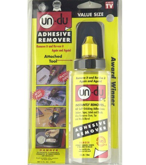 Un-Du Adhesive acid free remover for tape, stickers, labels, windshield stickers, gum from fabric and more. The environmentally friendly solution temporarily neutralizes adhesives and then evaporates allowing the removed item to be used again.