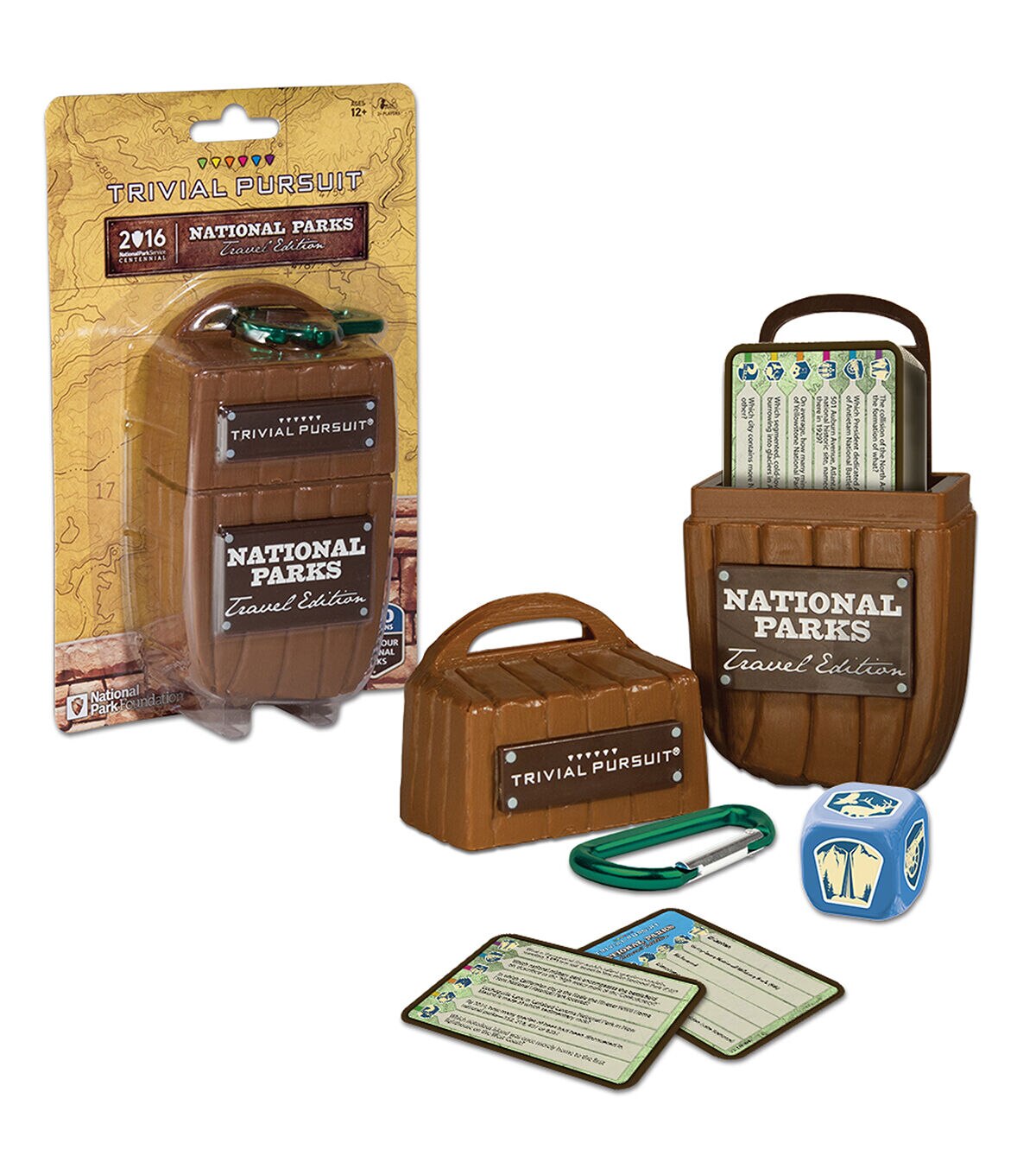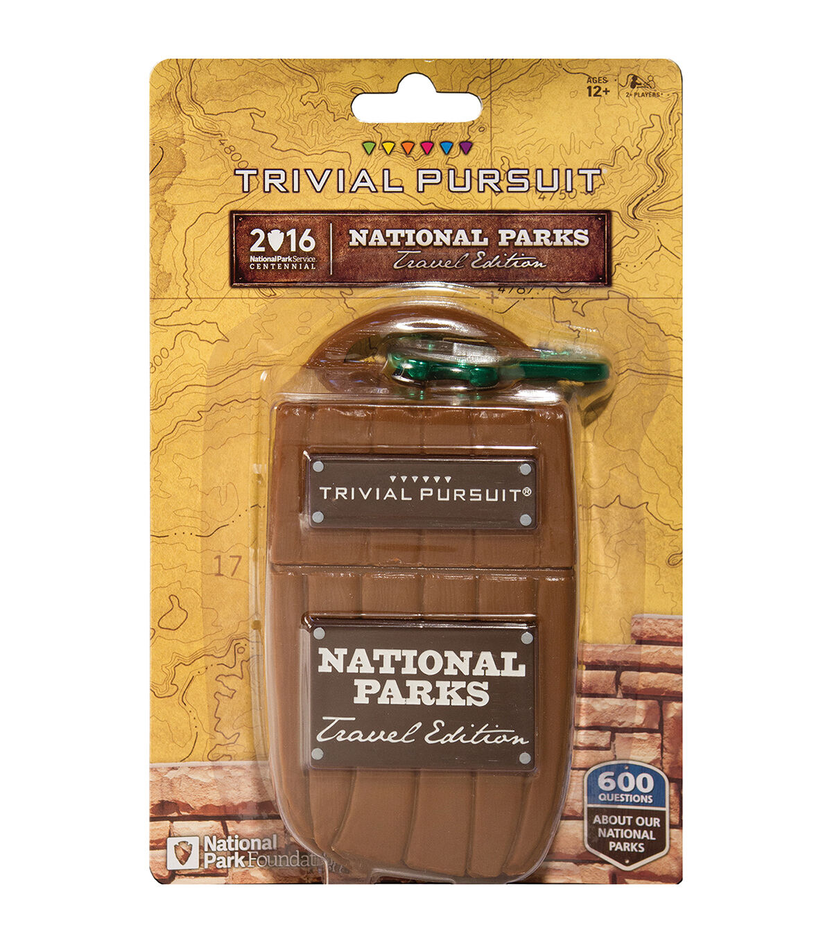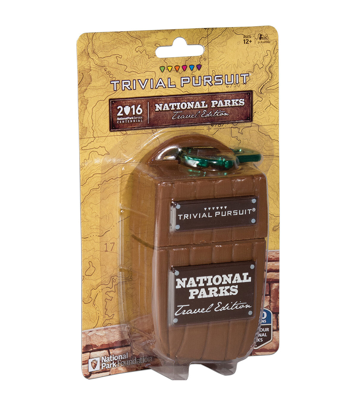 Test your knowledge of America's National Parks with TRIVIAL PURSUIT: National Parks Travel Edition. Trivia questions from 100 years of National Park history will challenge National Parks travelers, U.S. History buffs, students and families. Roll the custom die to pick from six categories: Natural Wonders, Battlefields and Historic Sites, Cultural Heritage, Science and Nature, Wildlife and Wildcard. First player to collect 6 cards wins! Hook the handy travel case to your backpack and play anywhere, around the campfire or even on the hiking trail! For 2+ players ages 12 and up. Game includes: • 100 cards feature 600 questions • Categories include: Natural Wonders, Battlefields and Historic Sites, Cultural Heritage, Science and Nature, Wildlife, Wild Card • 1 Custom Dice • Handy travel case with carabiner • Instructions