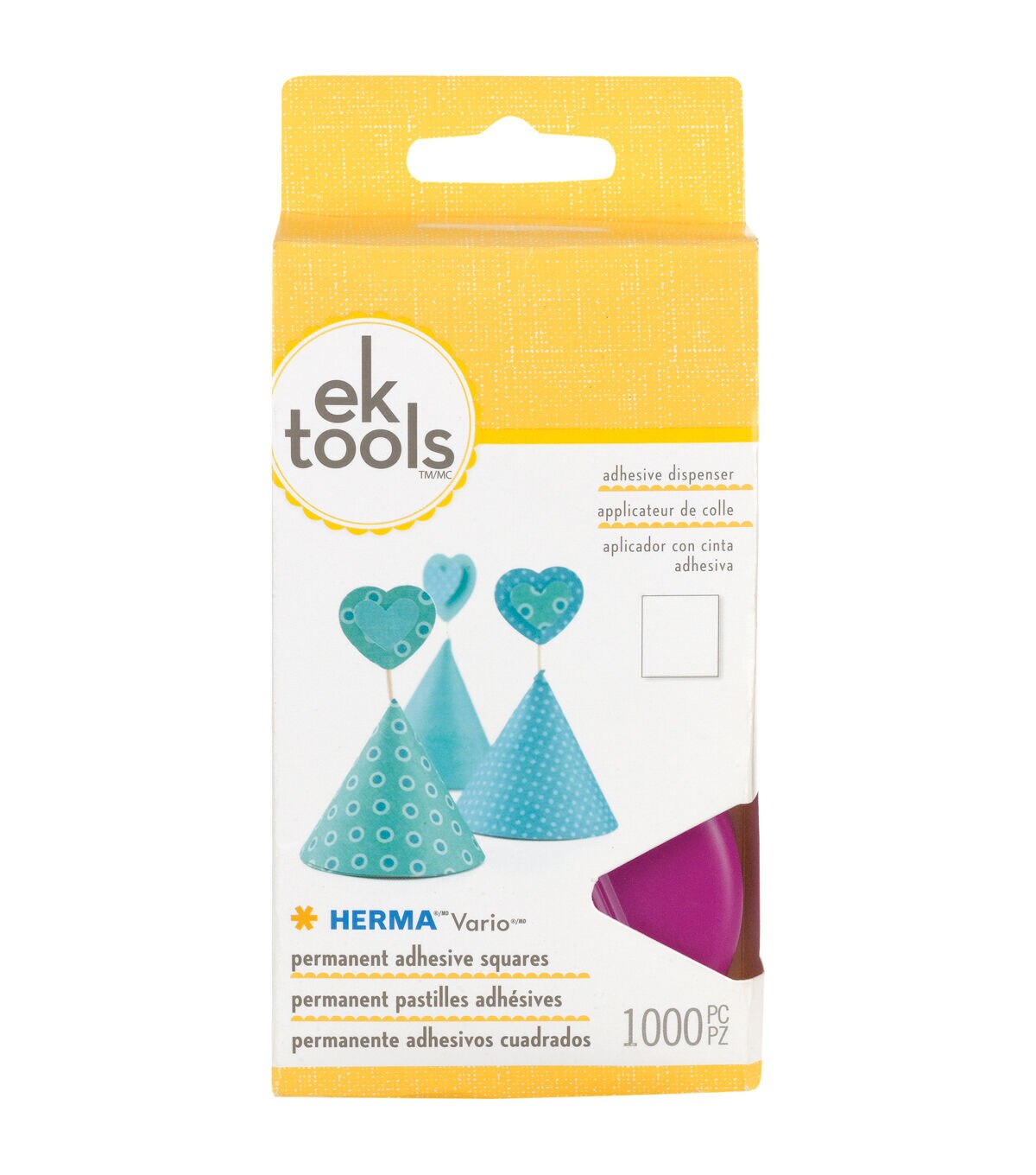 EK SUCCESS-Vario Permanent Adhesive Tab Dispenser. This is great for use with scrapbooking, office work and craft projects! Dispense in continuous lines or piece by piece. This package contains one 5 inch tall plastic dispenser and 1000 permanent adhesive squares. Imported.