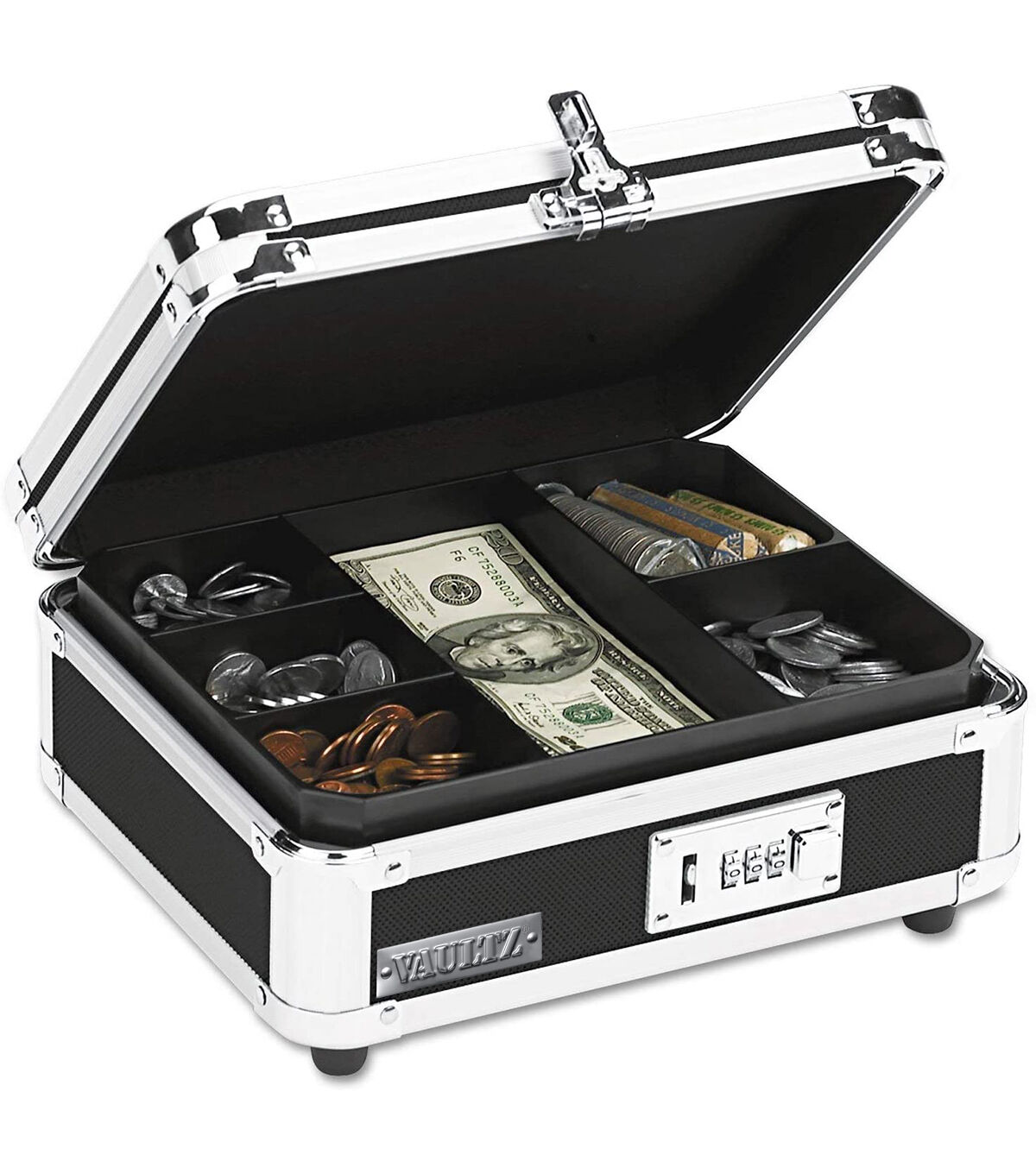 Finally an attractive cash box! The Vaultz Locking Cash Box features a plastic insert tray to organize bills and coins. This cash box provides plenty of room underneath for tickets, receipts, checks, or other valuables. The smooth chrome handle allows for comfortable carrying, and a combination lock provides convenient keyless locking. Rubber feet prevent skidding and scuffing.