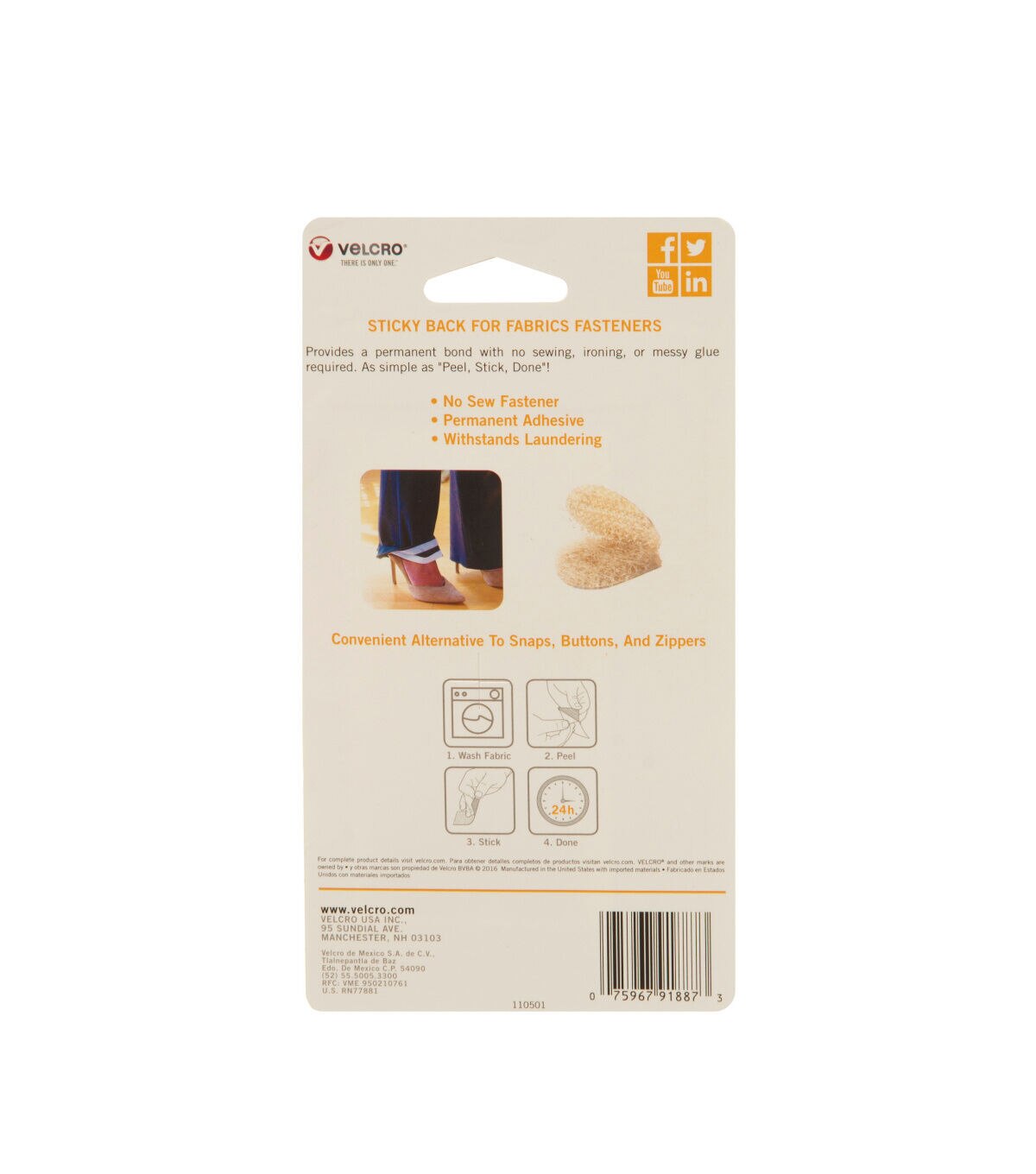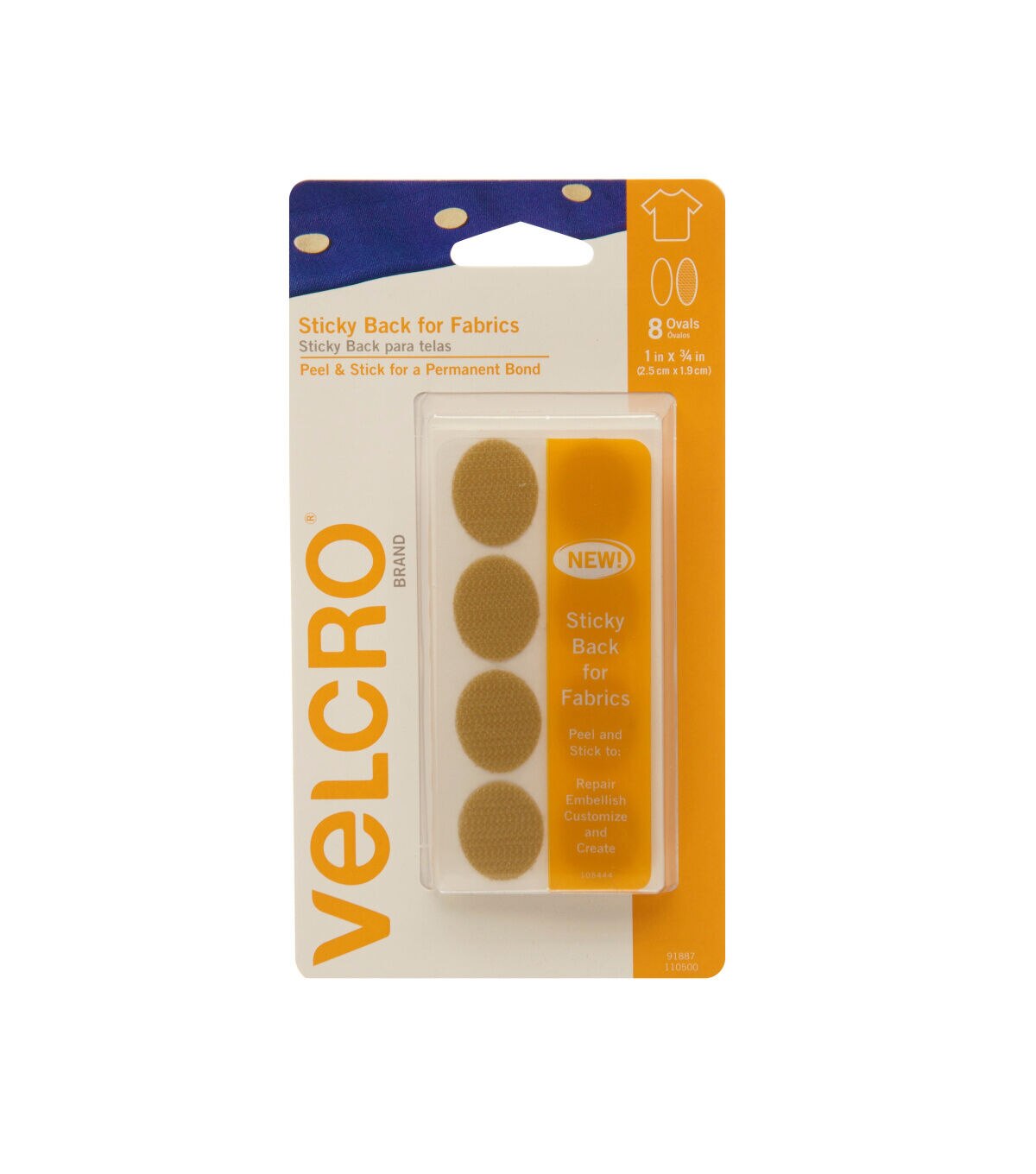 The VELCRO Brand Sticky-back Ovals for Fabrics - Beige are easy-to-apply, peel-and-stick fasteners that provide a permanent bond to fabrics. You need not sew, glue or Iron-on them to apply them to your garments. These low-profile knit oval fasteners withstand laundering and can be reused multiple times. They are great for fixing hems, shoulder pads, collars, sleeves, wardrobe gaps and costumes, personalizing fabrics with embellishments as well as accessorizing and attaching patches.