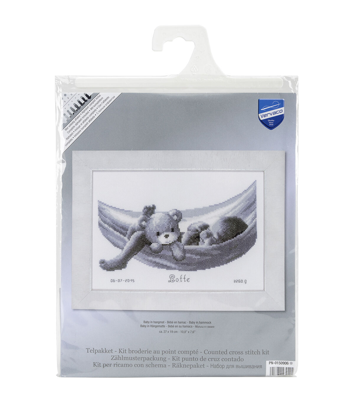 Mark the birth of your little one with the Vervaco 10.5'' x 7.5'' Counted Cross Stitch Kit-Baby In Hammock. This counted cross stitch kit comes with everything you need to complete the project, including 18 count 100% cotton fabric, 100% cotton DMC embroidery floss, a needle, a large full color finished model picture and instructions. You can frame and mount your finished project on the wall, or use it to make a lovely cushion cover.