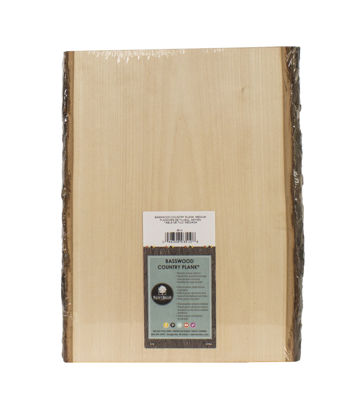 The Walnut Hollow Medium Rectangle Basswood Country Plank is perfect for painting, woodburning and decoupaging. You can turn this unfinished basswood plaque into a personalized platter, message, sign or clock for someone special. This pack contains one plank with bark.