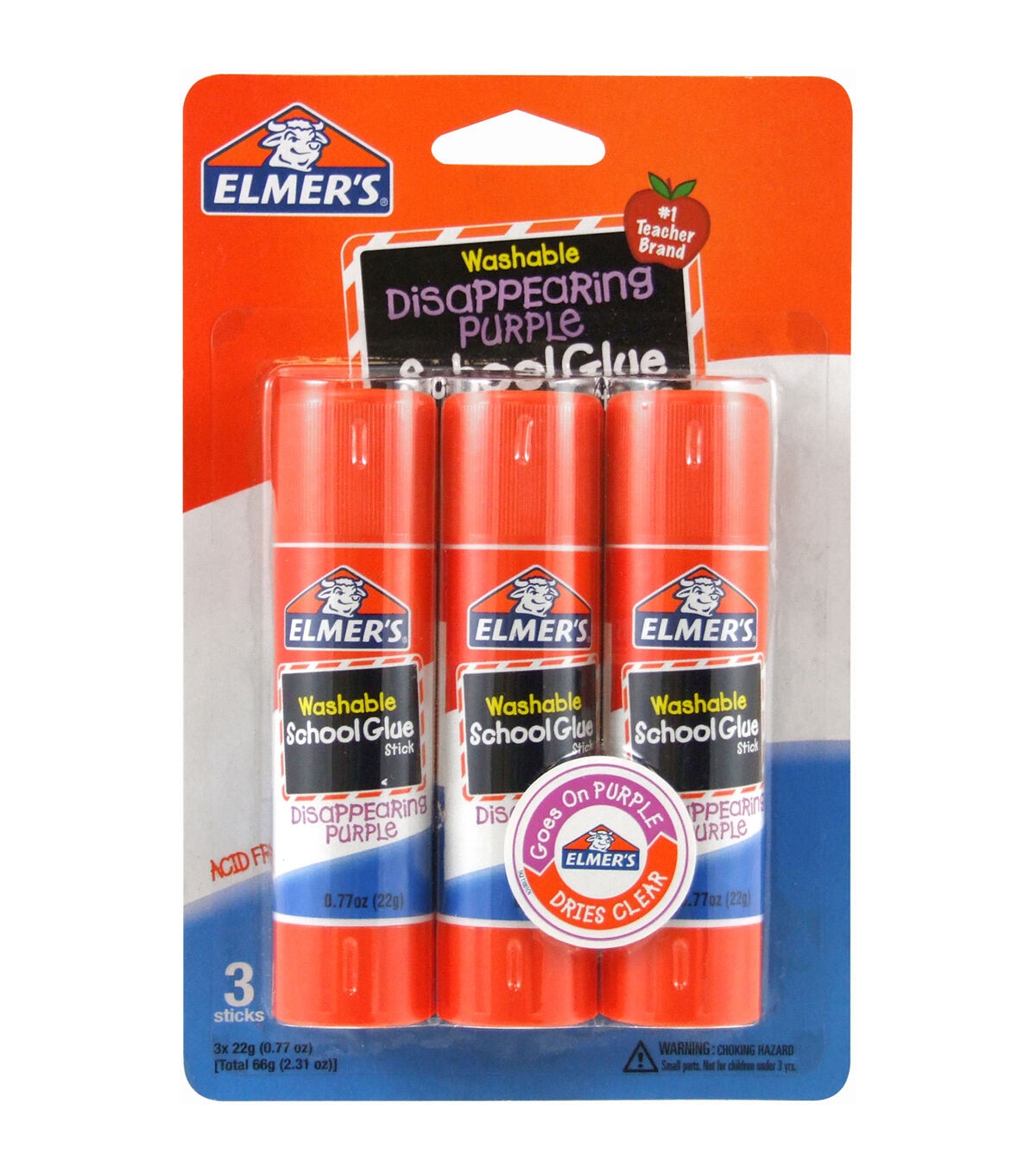 These glue sticks go on purple and dry clear. Non-toxic and acid free. Easily washes off hands and out of clothes.