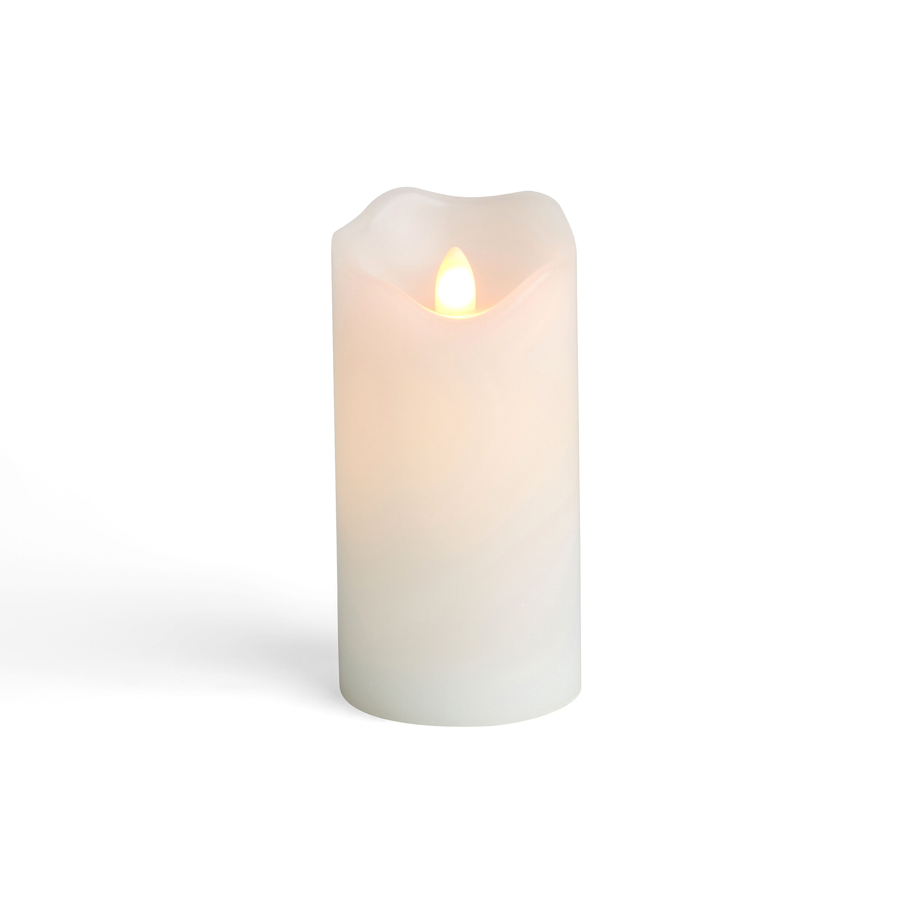 Creat an ambient glow with this 3'' x 6'' wave edge white color candle with Aurora soft glow dancing flame with LED in Body. Enjoy the soothing and relaxing flicker. With ON, OFF, 6Hr Timer switch on the bottom. Requires 2 C batteries, not included. For indoor or covered patio use only.