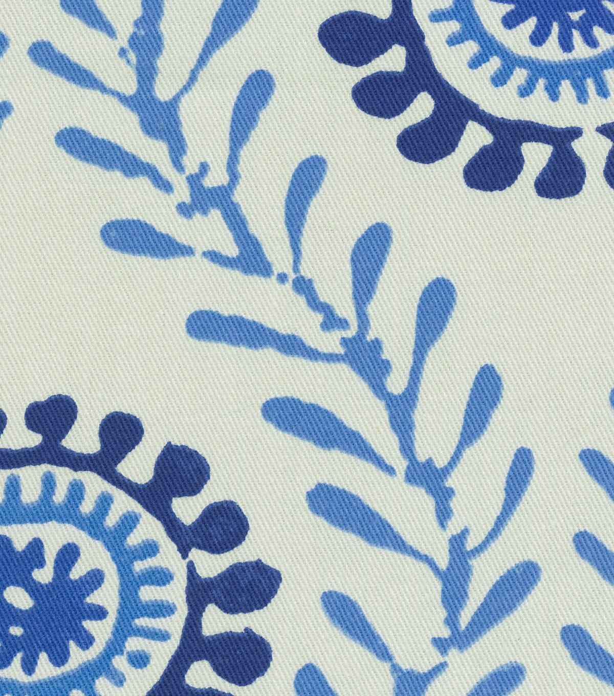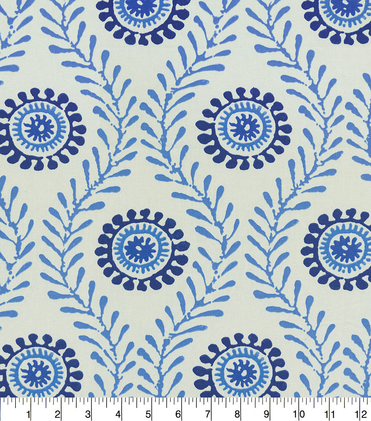 Waverly Fresh Spin in the Luna colorway. Bright and lively suzani floral print in shades of blue on a white background. Suitable for drapery, decorative pillow covers, headboards or other home decorating applications.