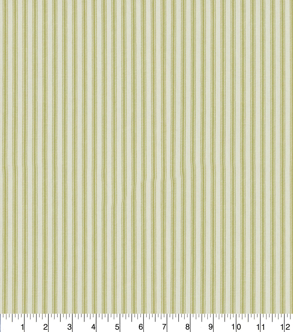 Upholster your living and bedroom furniture by using the Waverly Upholstery Fabric-Sage Classic Ticking. This printed fabric features a stripe pattern on a contrasting background. Suitable for making placemats, duvet covers, bedspreads and more, this 55-inch wide fabric is made of 100% cotton. Mix and match it with other upholstery fabrics, sold separately, to complement the design you have at home.
