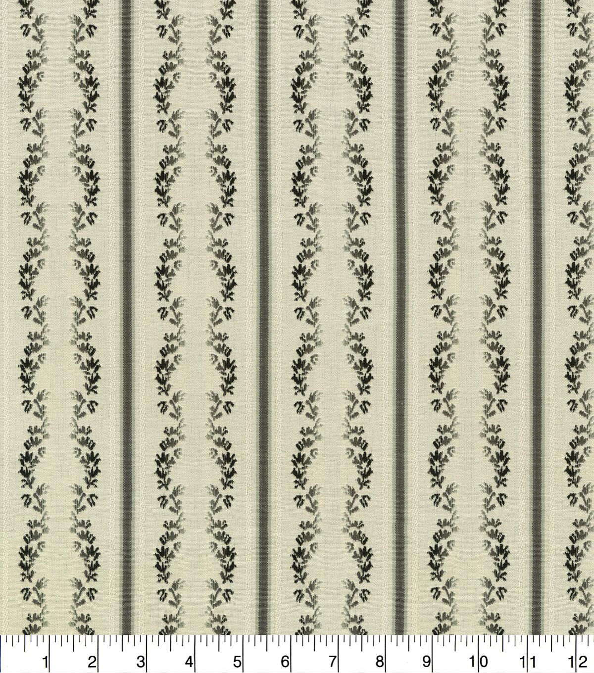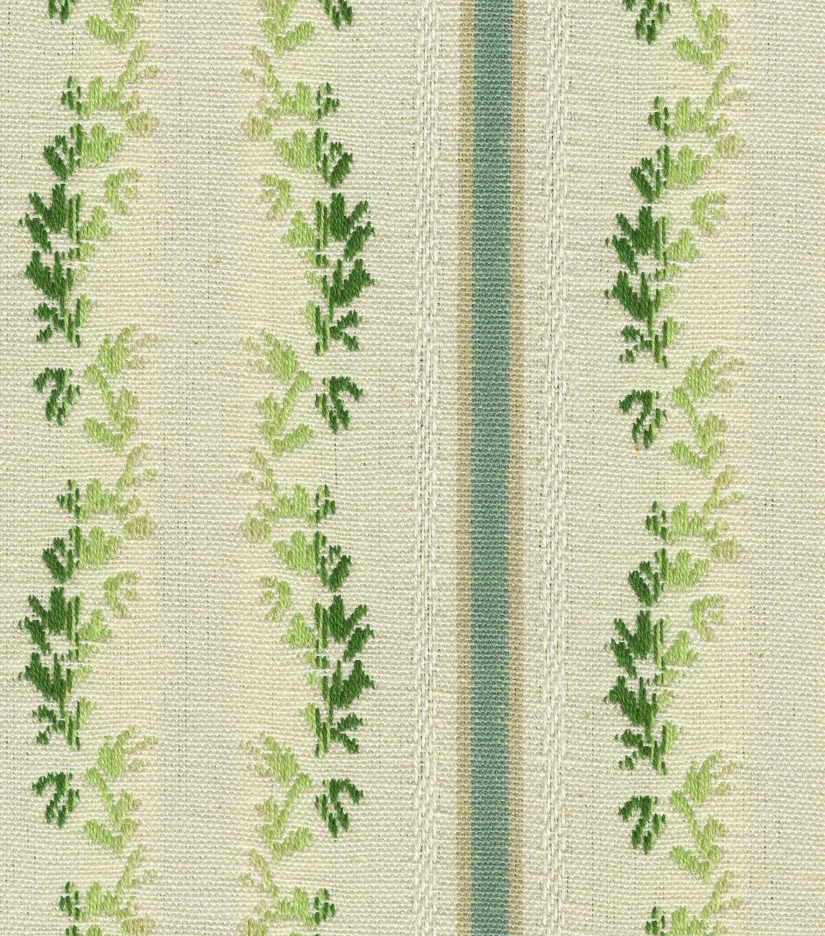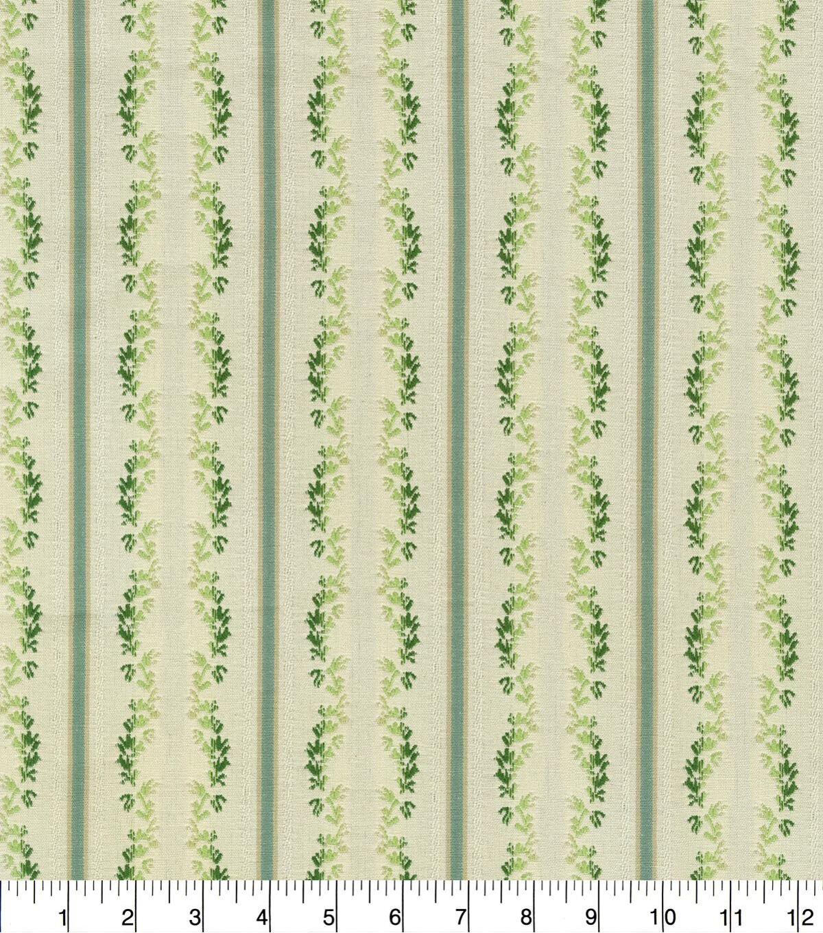 Waverly Regency Stripe brings a modern update to the 18th century lisere, presenting a more relaxed cotton contruction. Vertical stripes are embellished with columns of parallel ombre leaves. This Content: 100% Cotton, woven jaquard has a soft hand which allows it to be used for multiple applications & projects.