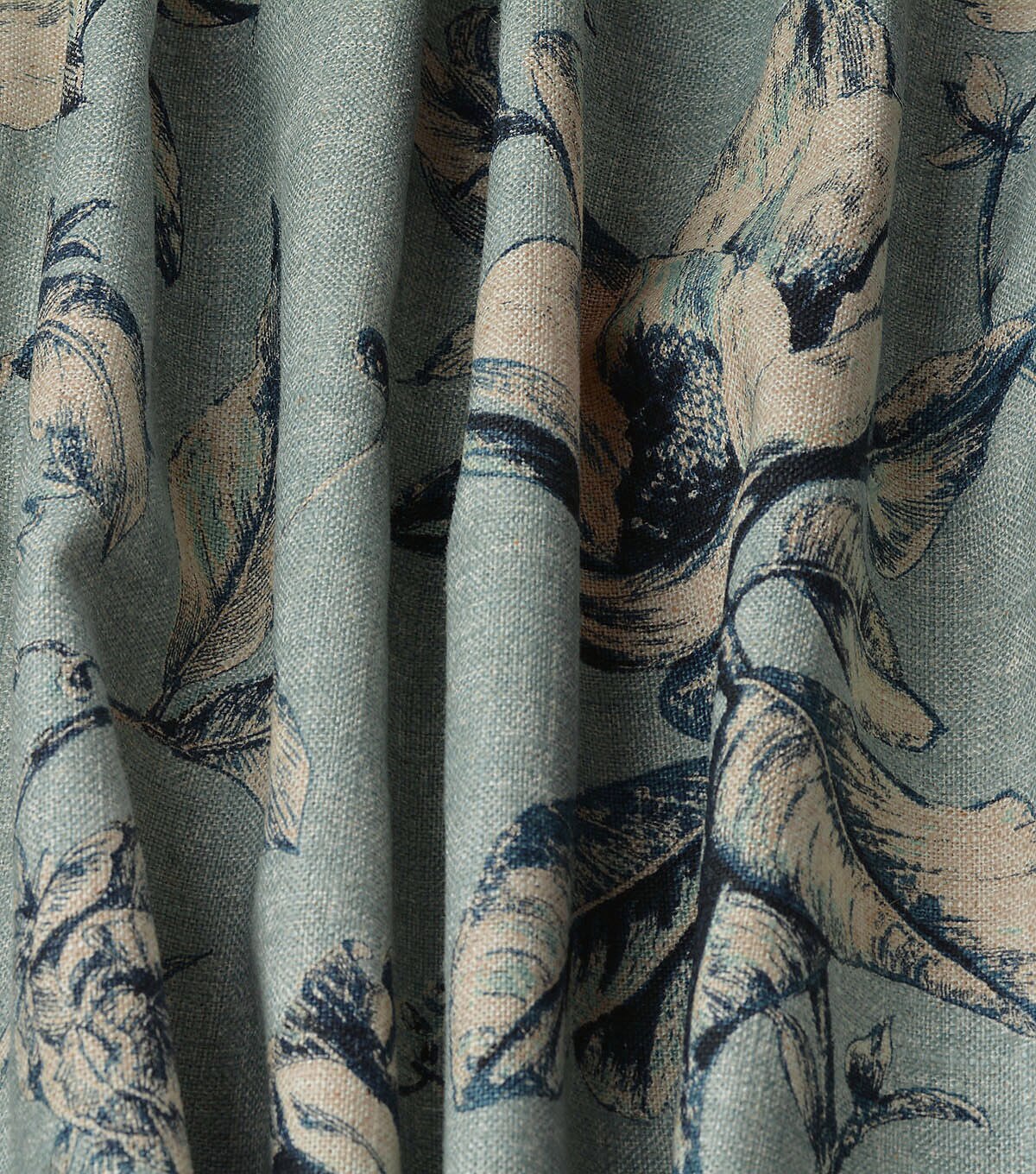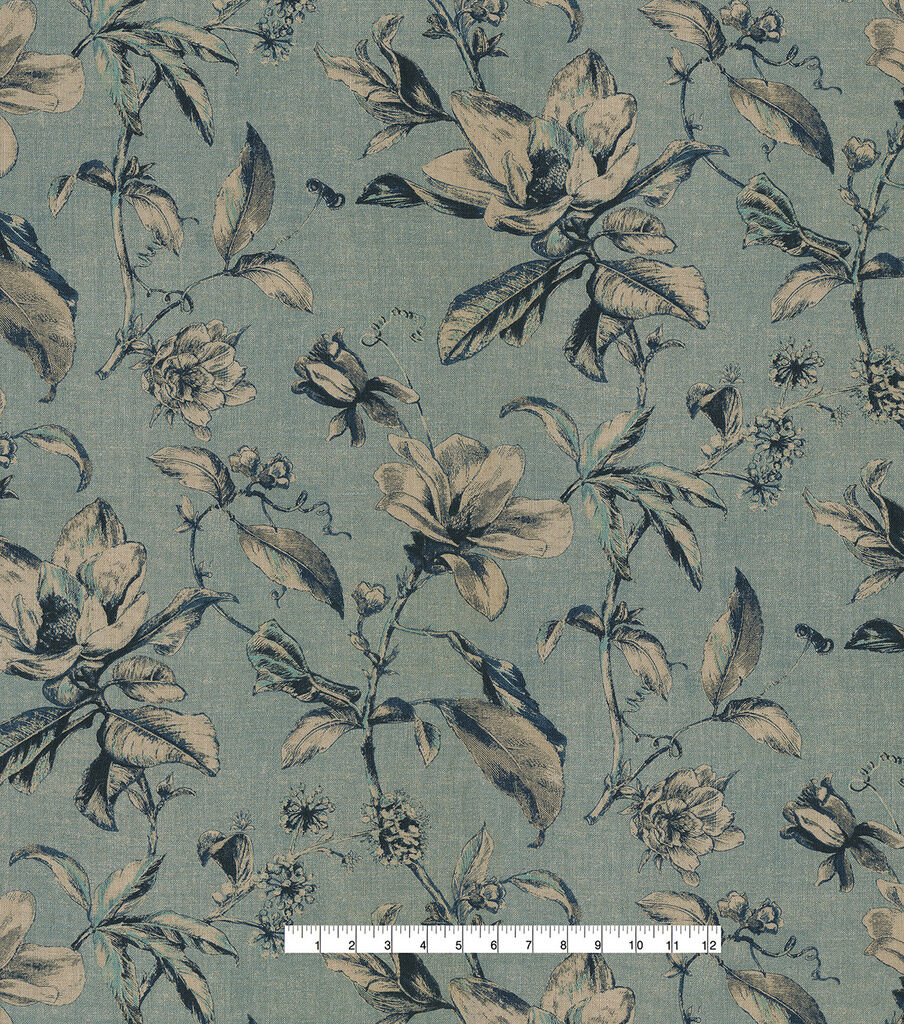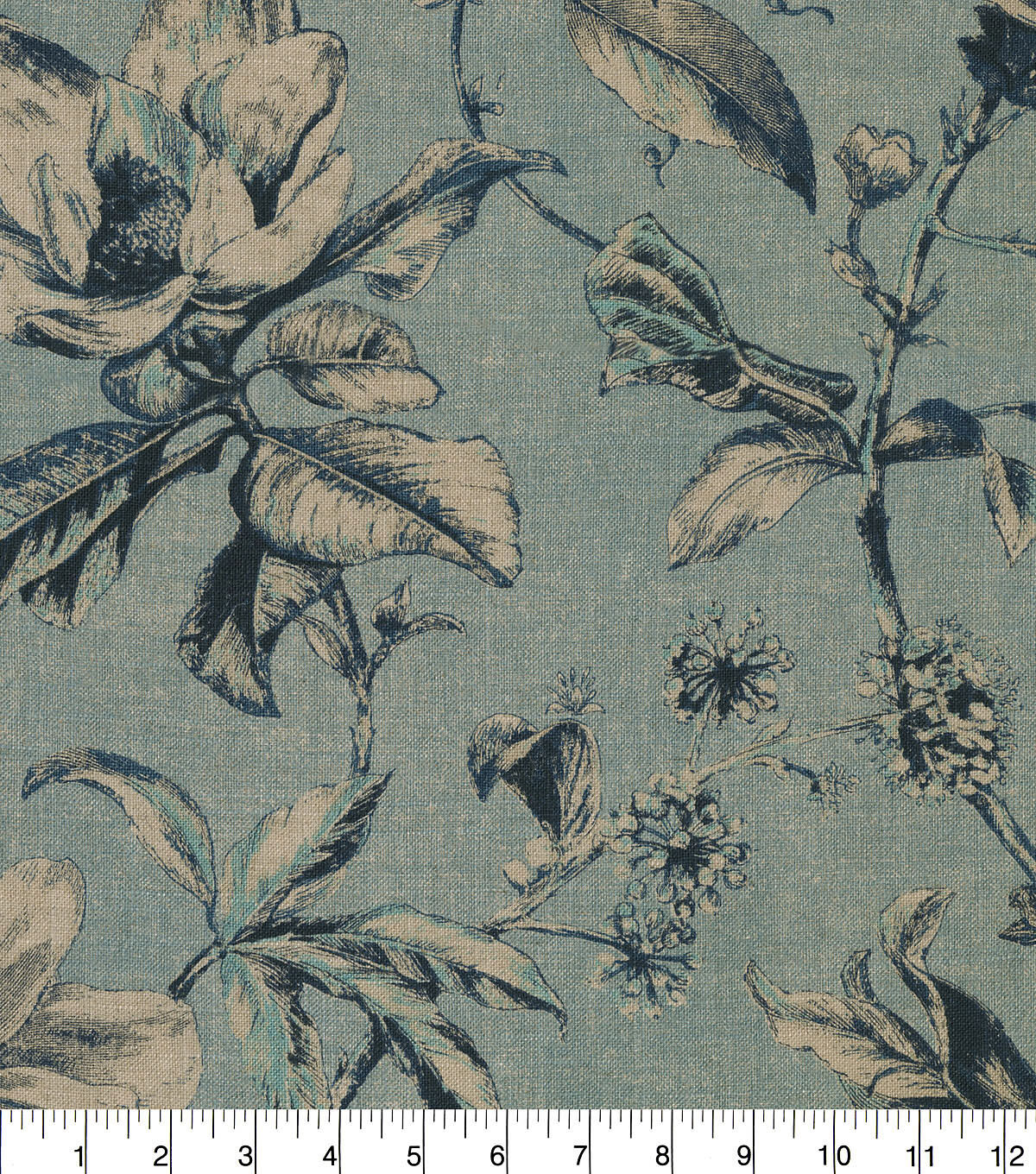 Waverly Sweet Bay Ink from the Cozy Life II Collection is a floral, vine and leaf design on a linen and rayon print cloth. Featuring a classically stylish yet comfortable pattern with a relaxed, lived-in feel, Cozy Life II blends beauty with simplicity. This is printed in the colors Navy Blue and Sand on a Soft Blue background printed to give an aged appearance to the cloth. Very creative! Sweet Bay can be used for draperies, curtains, cornice boards, pillows, cushions, bedding and furniture upholstery.
