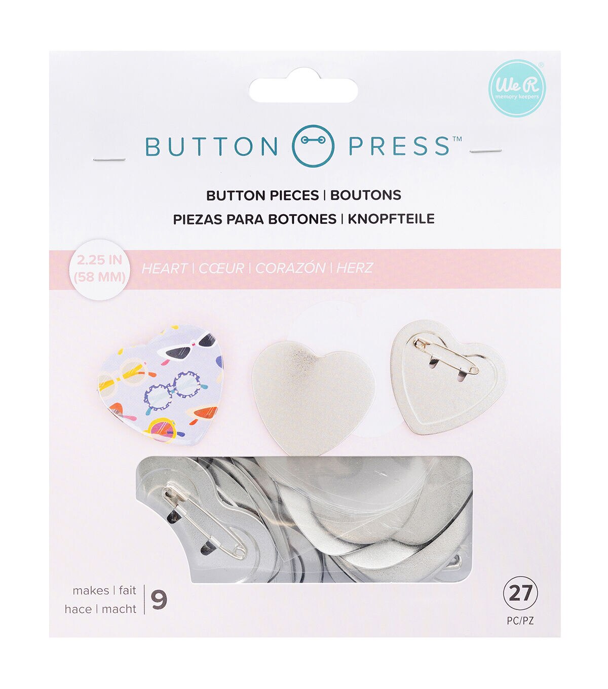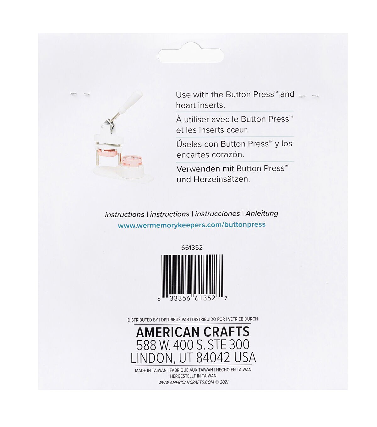 Easily create buttons, magnets, keychains, and more with the Button Press by We R Memory Keepers! And with our new heart-shaped attachment, you can make adorable heart projects in your favorite designs and patterns. This package includes materials to make 9 heart-shaped buttons (27 pieces total) in a 58 mm size.