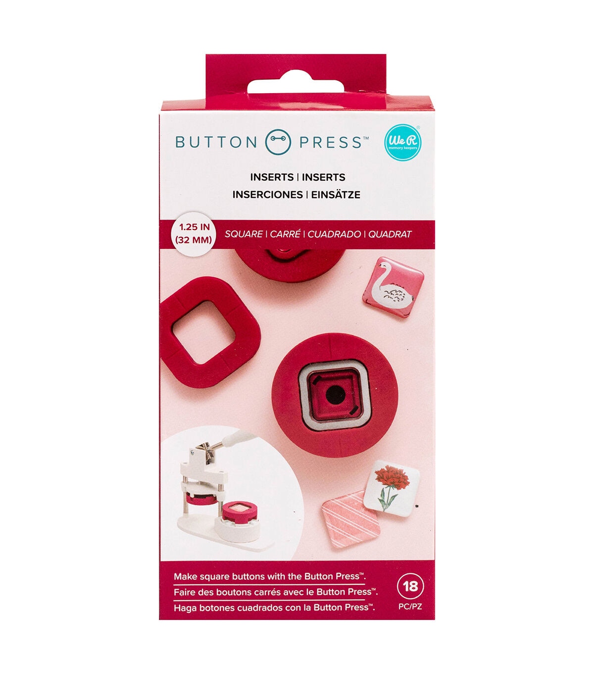 Easily create buttons, magnets, keychains, and so much more with the Button Press by We R Memory Keepers! This unique press cuts your favorite papers to the correct size for unique square projects. The Button Press features an easy-to-press handle, and can be used to create buttons out of paper, cardstock, and fabric. This package includes one square Button Press insert, and enough material to make 5 square customized buttons.