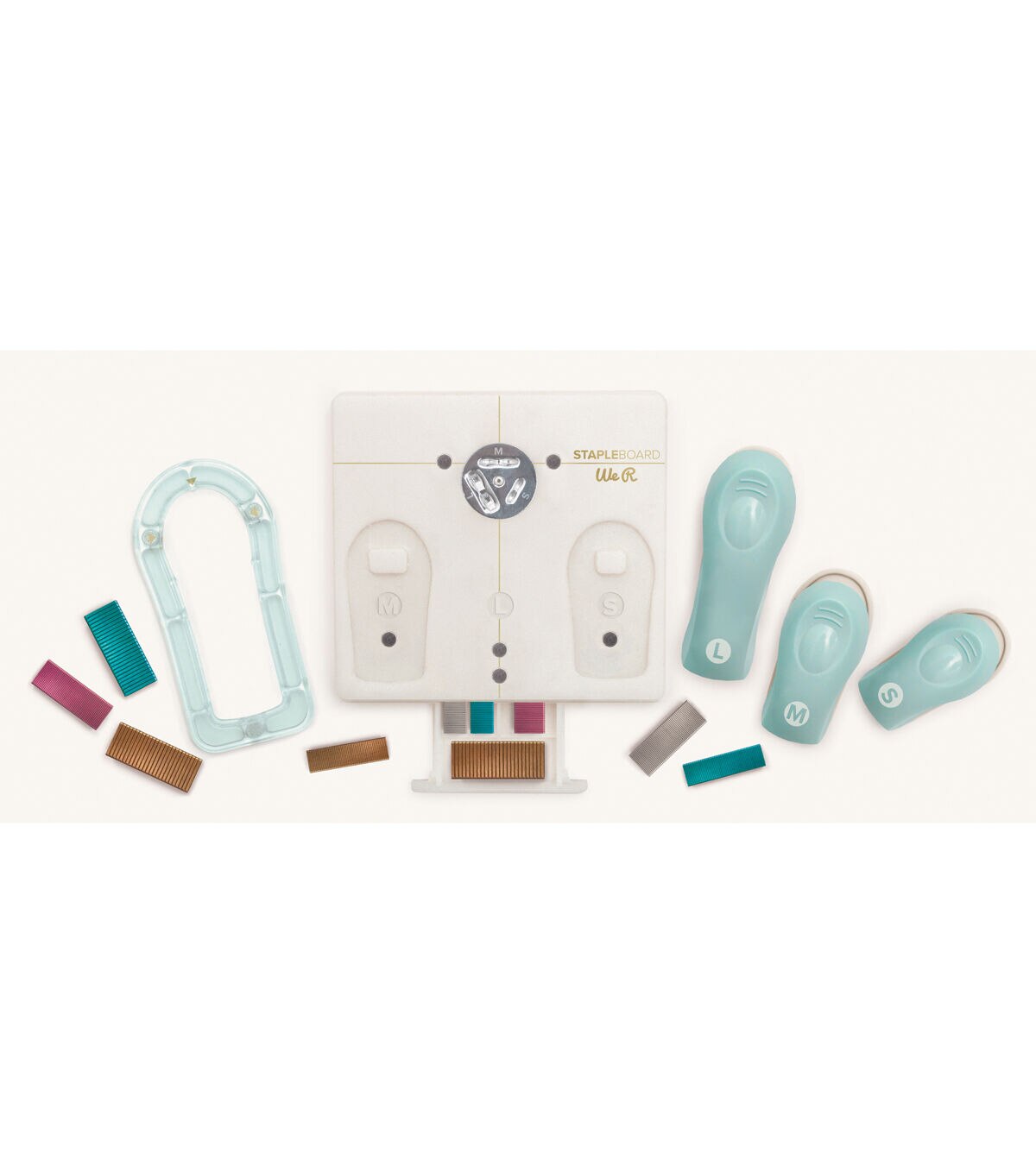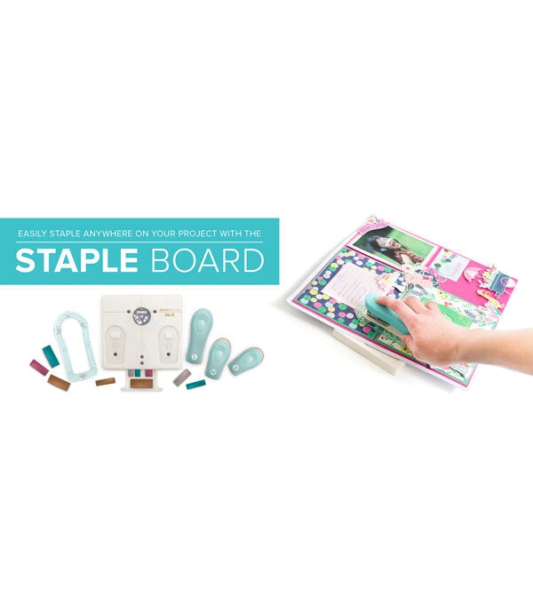 Staple anywhere on your decorative layout with the We R Memory Keepers-Magnetic Staple Board. It features a built-in staple storage compartment and includes small, medium and large magnetic staplers with additional 250 staples. The staples come in three different sizes and four distinct colors. This staple board is ideal for attaching embellishments or memorabilia onto your project layouts.
