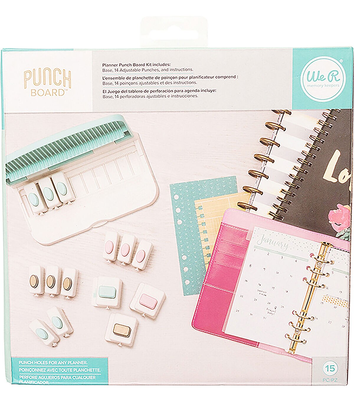 Punch perfect sized holes for any of your planners. Customize to your liking, add as many pages as you want. This 7.6x5.5 inch package contains an alignment base and 14 punches in one box. Punches include standard, disc, and spiral and are interchangeable for easy customization and lock together for storage. Also includes an easy reference chart and instructions. WARNING: Choking Hazard. Not suitable for children under 3 years. WARNING: May contain items with sharp edges. Handle with care. WARNING: Cut Hazard, Sharp Blade. Contact may result in injury. Always keep blades away from fingers and body. Handle with Care. Keep out of reach of children. Imported.