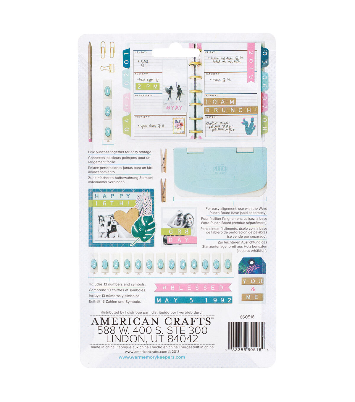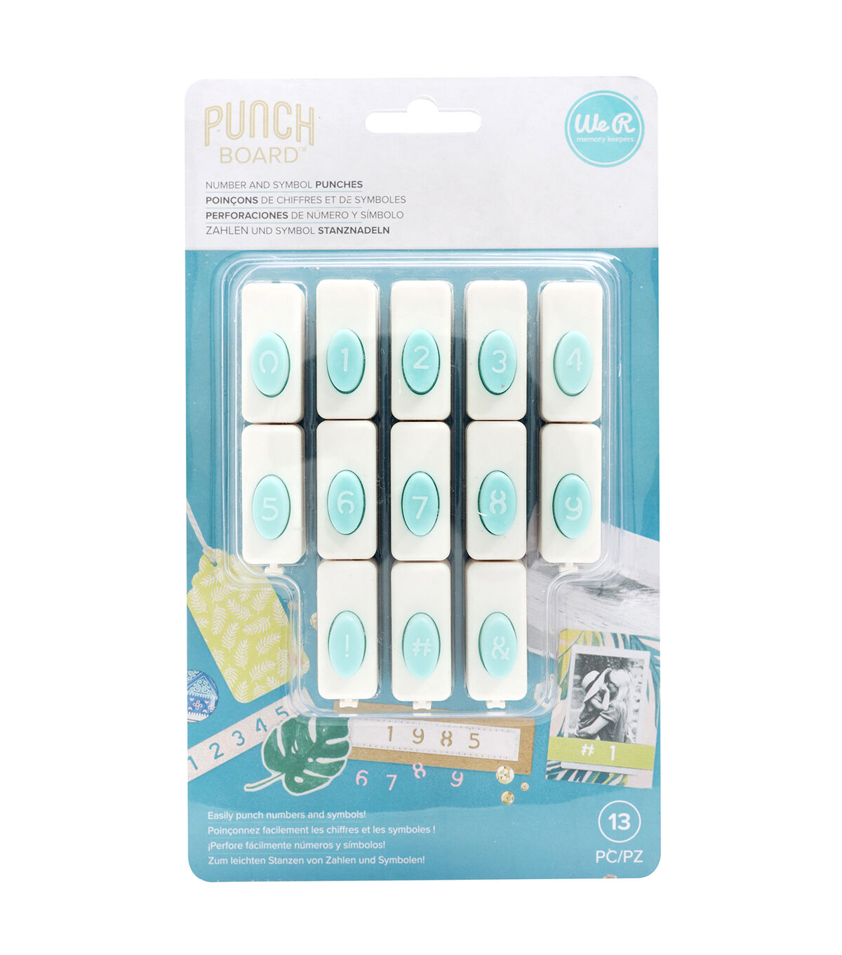 The Word Punch Board by We R Memory Keepers packs the perfect punch every time! And you can pair your Punch Board (sold separately) with number and symbol punches for even more possibilities! Mix and match numbers and symbols to create personalized dates, phone numbers, and more for all kinds of paper crafts! This package includes 13 punches in a variety of numbers and symbols.