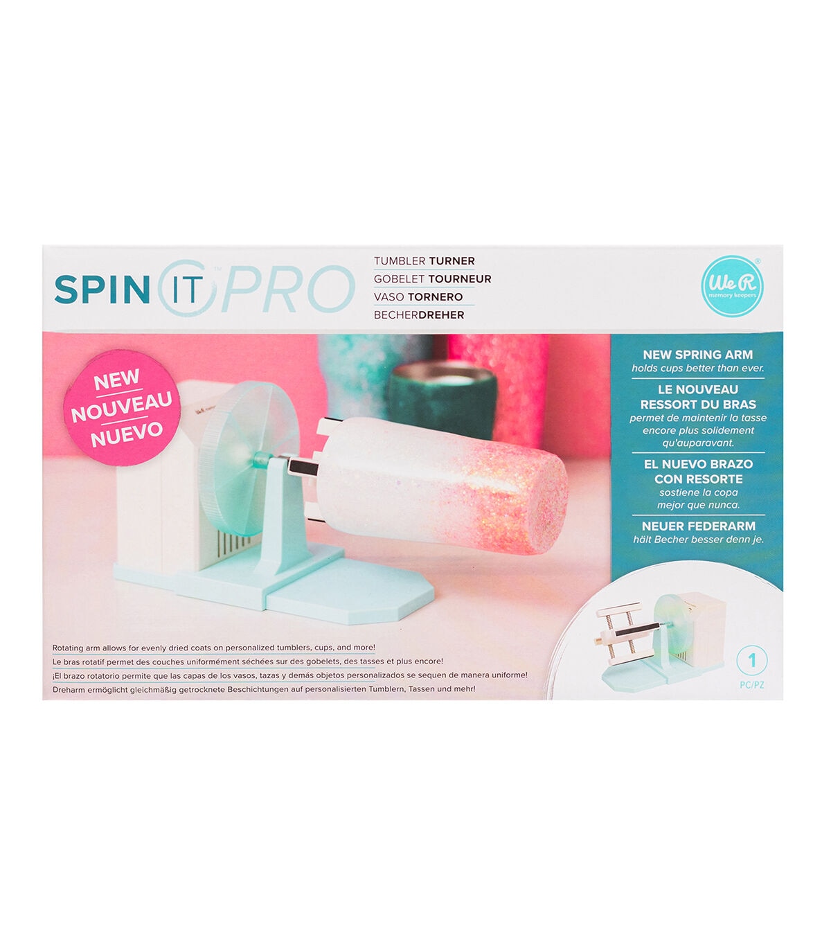 Projects come full circle with Spin It by We R Memory Keepers! We've improved some key features to make your projects run even smoother. The new spring-loaded arm securely holds your cups in place so they won't slip while spinning. An added support beam keeps the arm upright while spinning, decorating, and drying. And the ridged base lets you easily unscrew the arm from your Spin It even with the cup attached! You can also use the base as a stand for additional decorating and drying. Add your favorite embellishments to customize your projects, then place them on the adjustable grip, and give it a spin! This package includes one Spin It Pro Tumbler Kit.