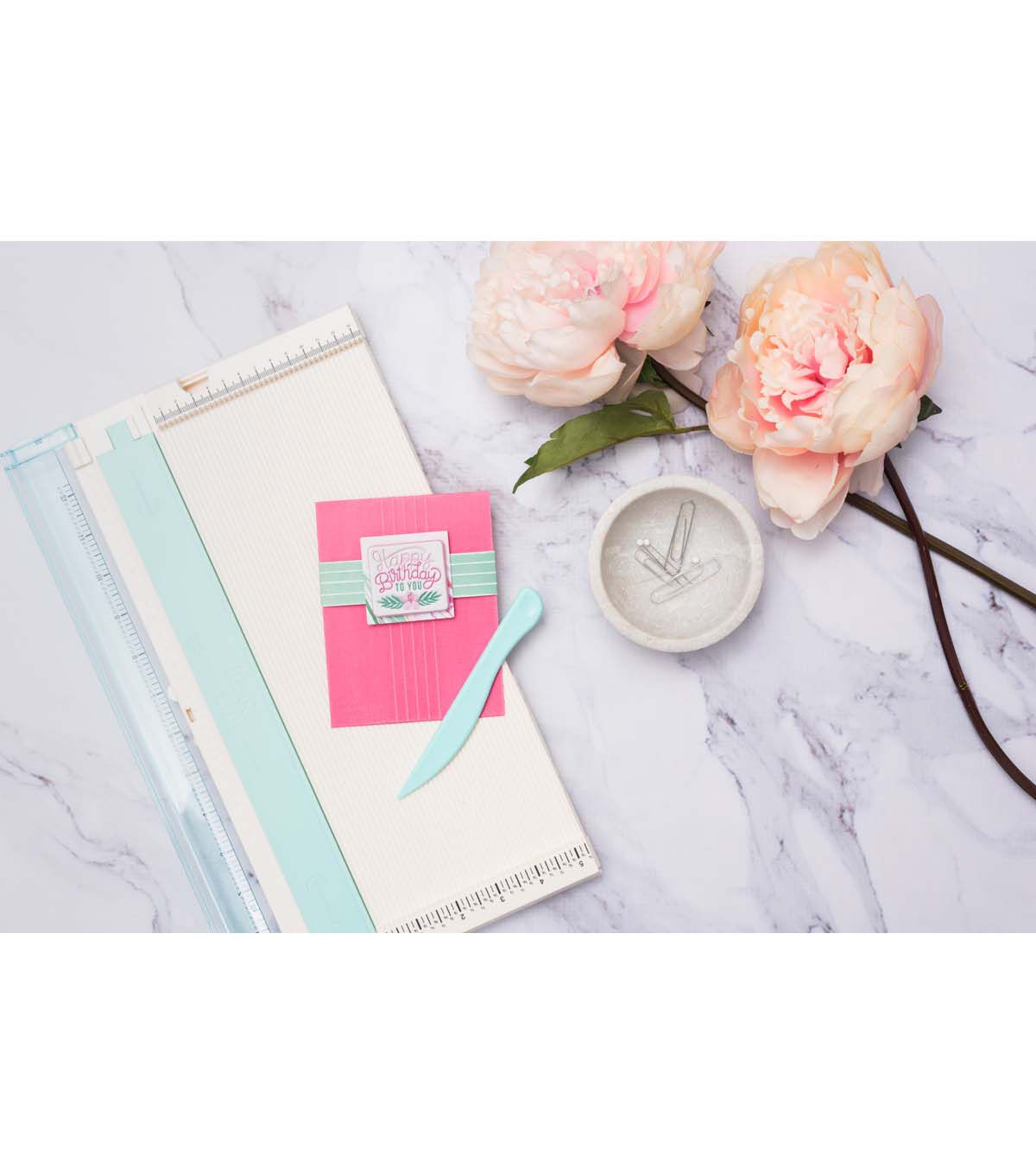 Perfect the art of scoring and trimming with the We R Memory Keepers Trim & Score Board. This pack includes one unit of trim and score board that unfolds into a 12 x 12 inch surface with imperial and metric measurements to cut and align your papers. Use this convenient tool along with the included score and fold tool to quickly trim and score your craft projects.